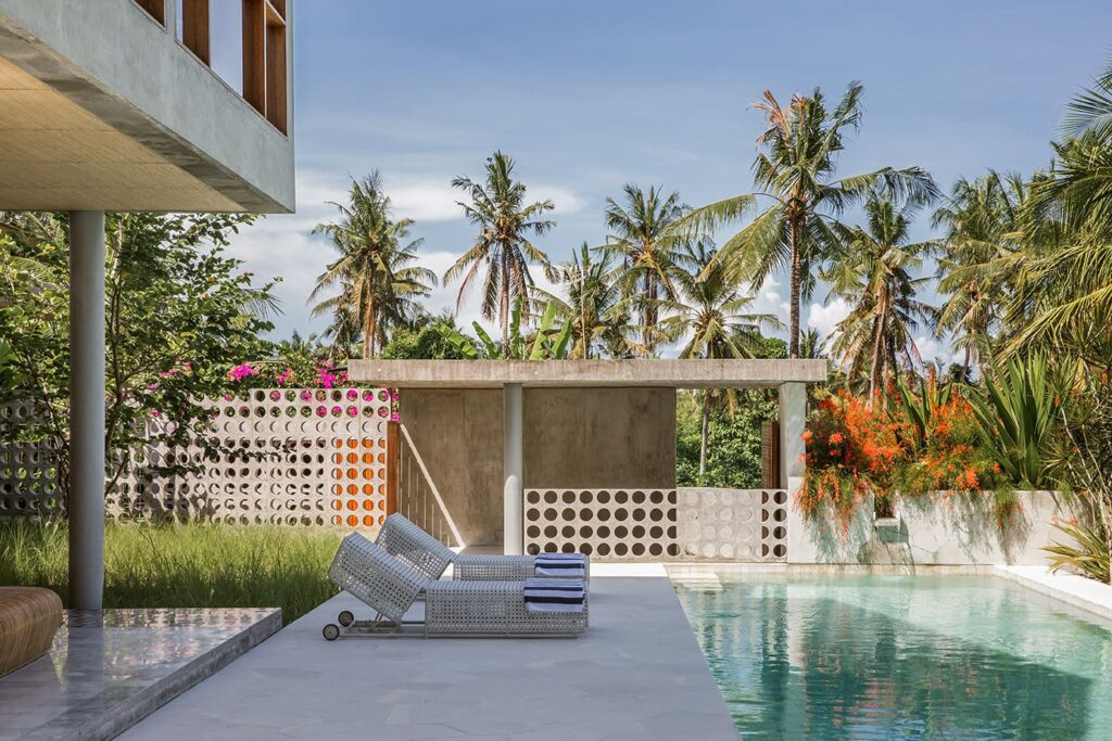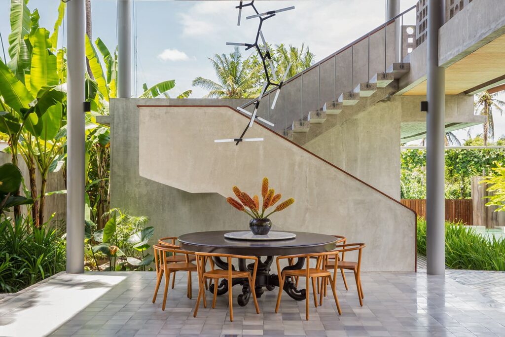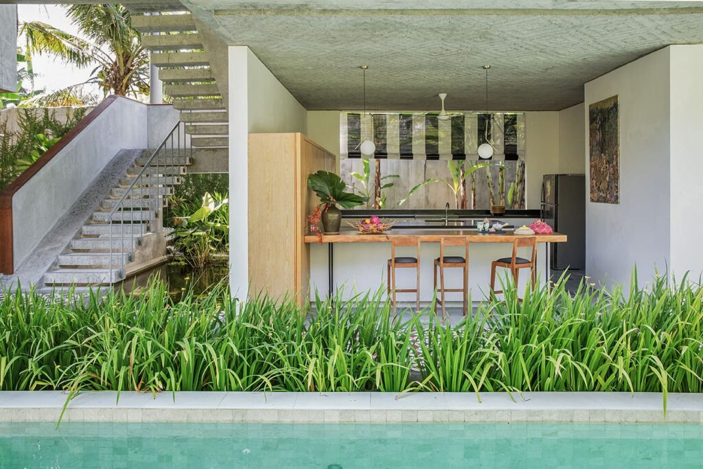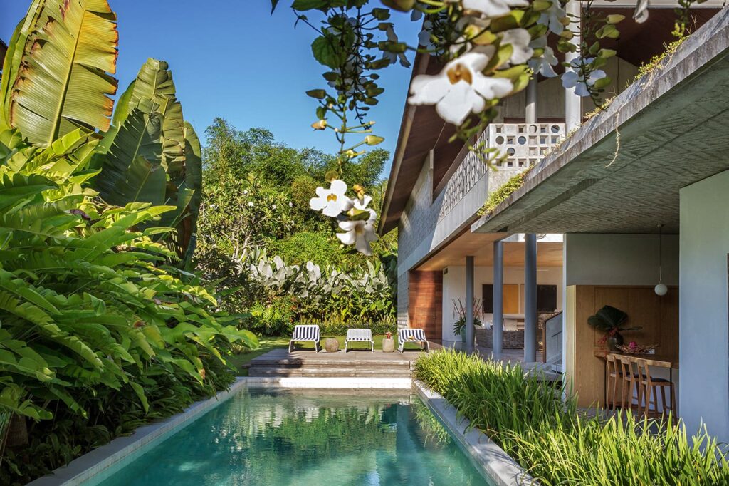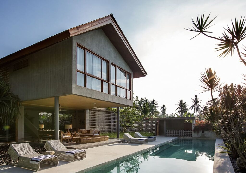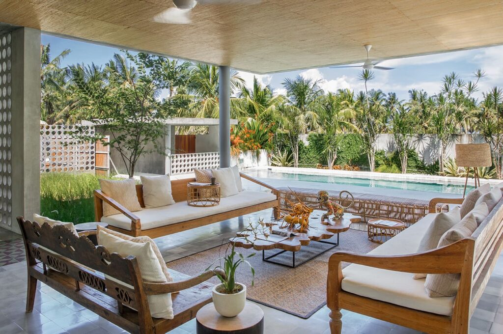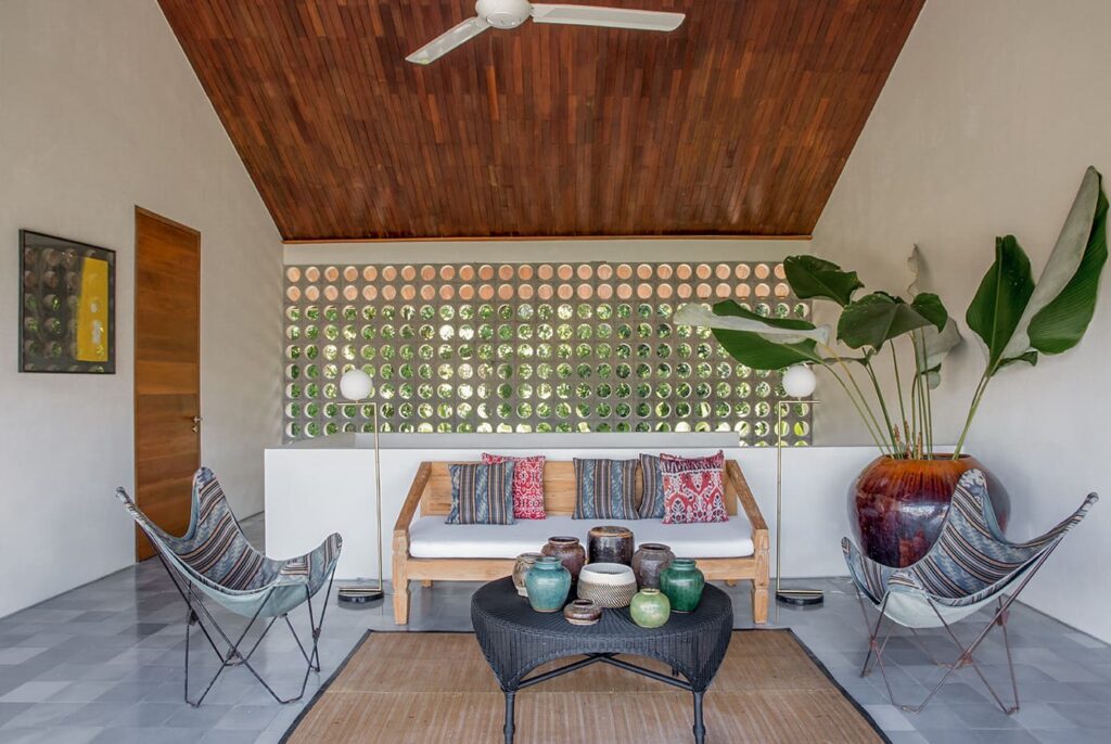 The architectural brilliance behind this property comes from a highly skilled Singaporean architect, whose work has been featured in AD magazine. Each house within the development has been thoughtfully designed to cater to tropical living, ensuring comfort and relaxation. Each building boasts an open-plan living area where you can freely enjoy Bali’s weather, while the bedrooms are designed as self-contained suites, offering maximum privacy. Inspired by the charm of traditional Balinese village clusters, the houses feature elements drawn from the local architecture. Notably, the undulating pitch roofs utilize SIRAP or ironwood shingles, and the incorporation of screen walls promotes natural ventilation, while overhangs provide welcome shade. The material palette used encompasses locally sourced elements such as stone, marble, colored cement tiles, and timber.