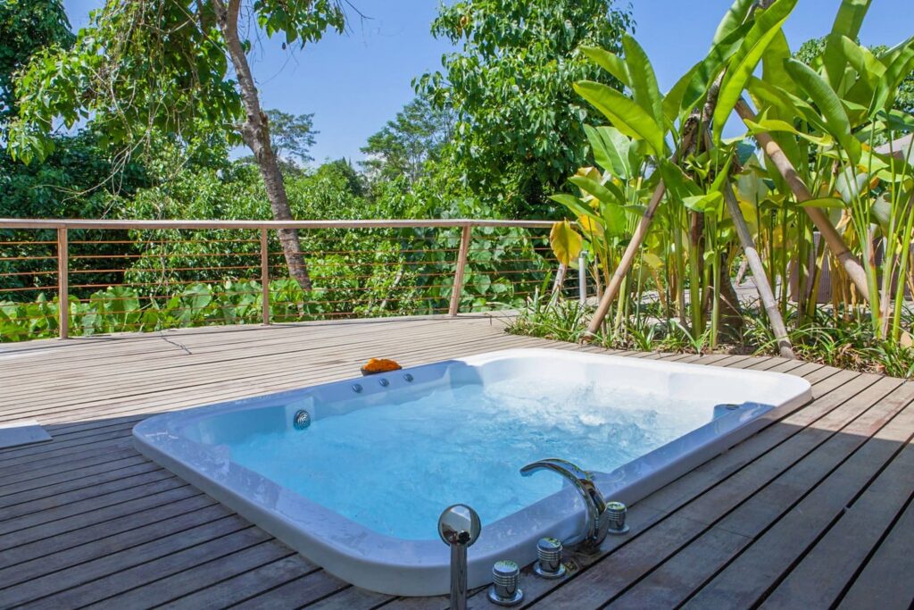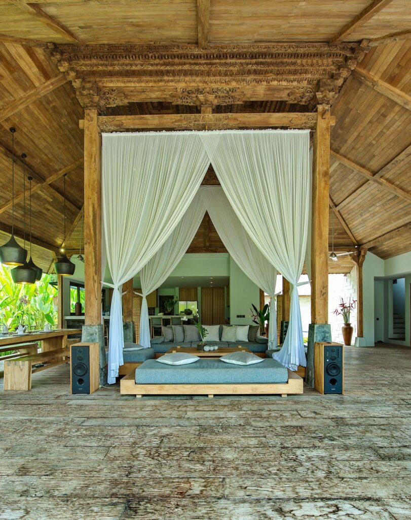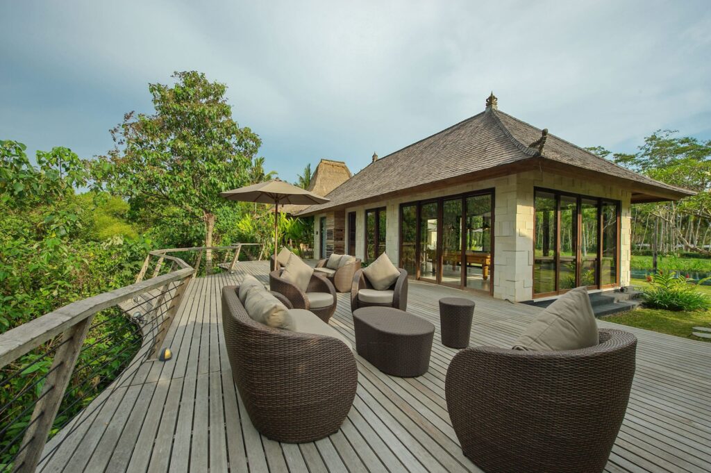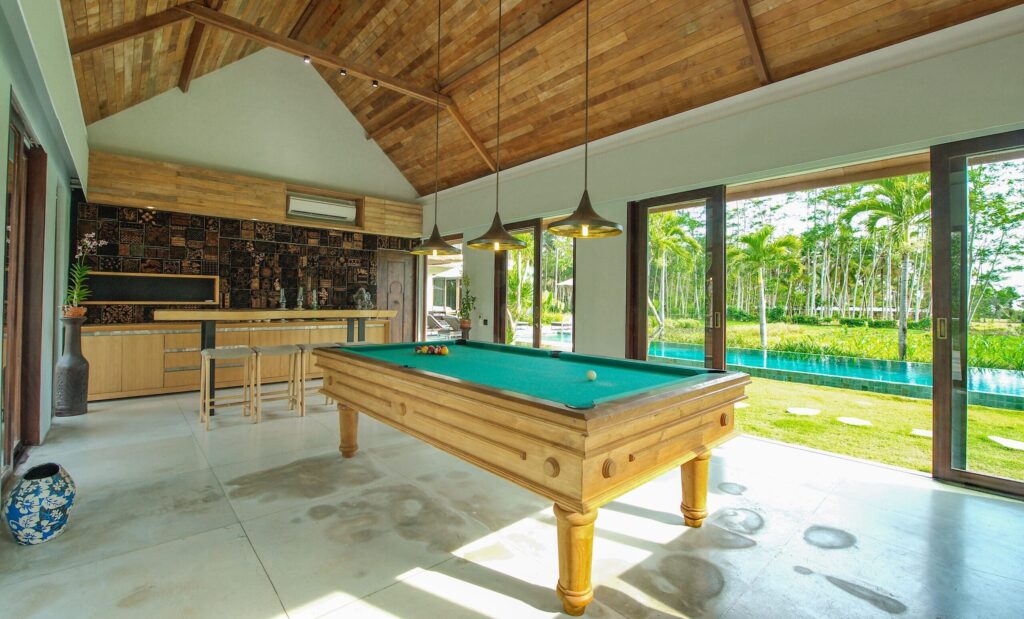 This villa features as well as 4 bedrooms with mezzanines, each equipped with a king-size bed and a queen-size bed on the mezzanine level, also with en-suite bathrooms. It includes an open living room and dining area alongside a fully equipped kitchen. Guests can enjoy the 20-meter-long swimming pool with a separate paddling pool for children and a Jacuzzi accommodating up to 6 guests. Stay active in the fitness center, equipped with top-of-the-line commercial-grade equipment imported from Europe, or unwind in the TV room with a wide selection of international and local channels, complemented by an iMac 27″ for music selection. Other amenities comprise a billiard and bar area for leisurely drinks and games, complimentary Wi-Fi throughout the villa, and mountain bikes for exploring the surrounding area. Additionally, there is a staff room with a bathroom for added convenience.