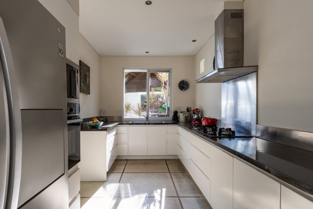 The estate is composed of two elegant pavilions, offering three generously proportioned ensuite bedrooms, a charming guest cottage, and discreet staff quarters. The gabled-roof pavilion is dedicated to the master suite and a serene home office, while the main pavilion features a professional-grade kitchen, an elegant dining area, and a light-filled living space that opens onto a balcony with sweeping ocean vistas.