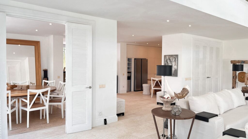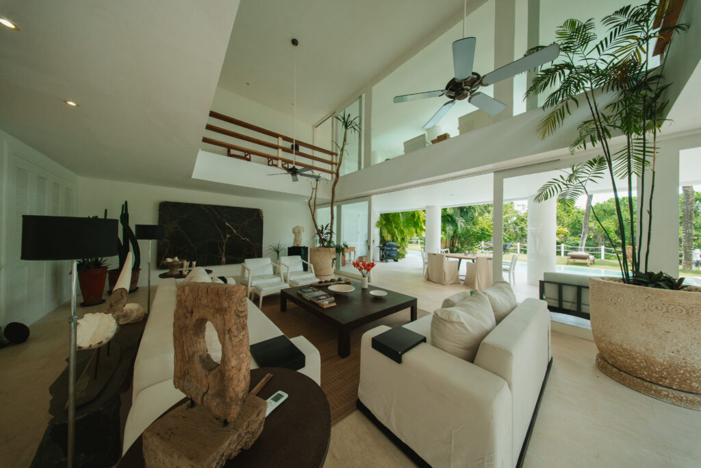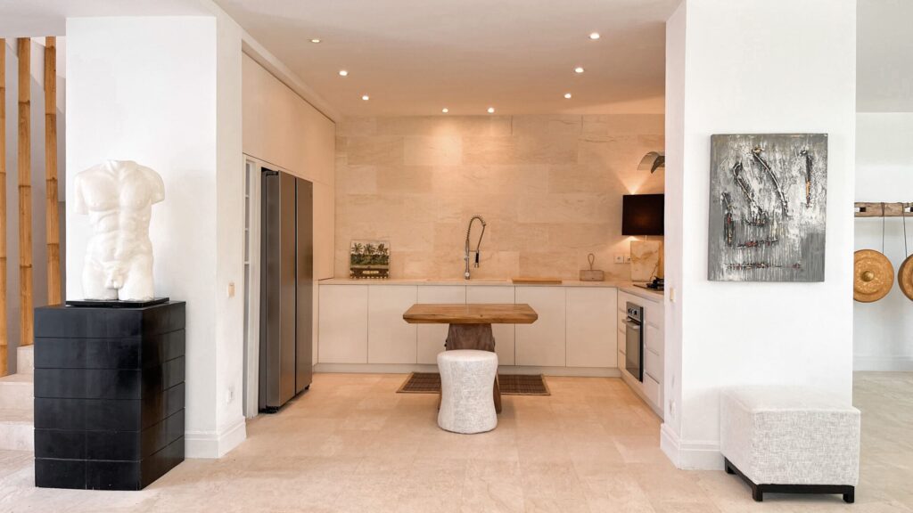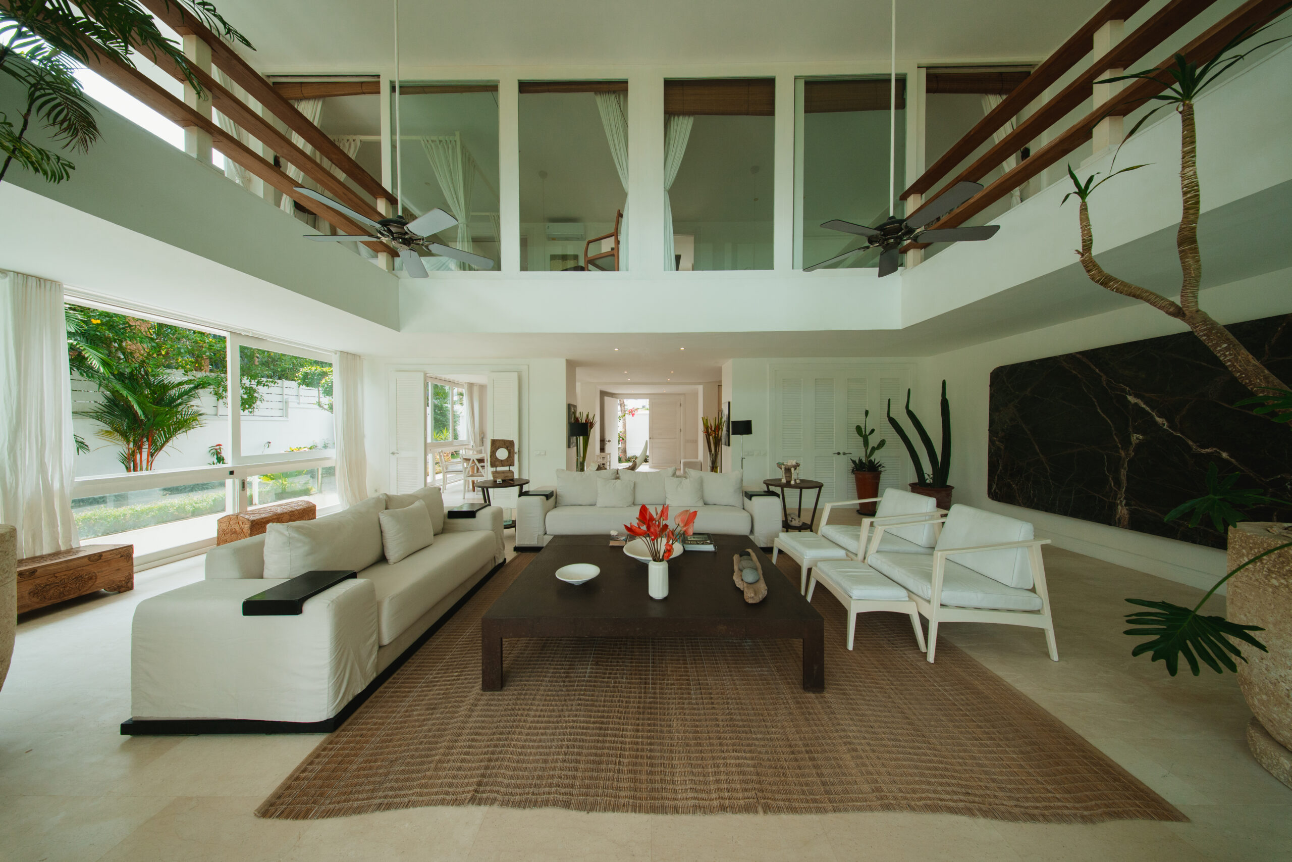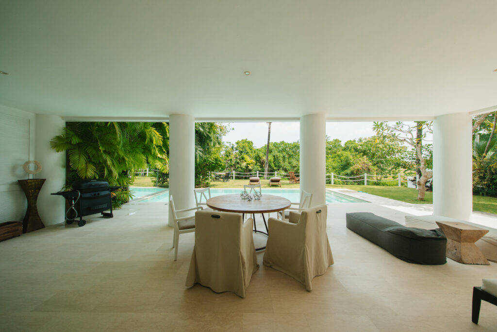 Indulge in luxury living in this villa, which boasts high-quality materials and a luxurious white-based interior design created by a world-renowned architect, who has achieved perfection in every detail. The furniture has been carefully selected to create a modern and clean aesthetic. The villa features a spacious living area that seamlessly blends into the dining area and modern kitchen, which overlooks a beautiful outdoor area consisting of a sparkling swimming pool, lush garden, and terrace with stunning views of the rice fields, river, and waterfall.