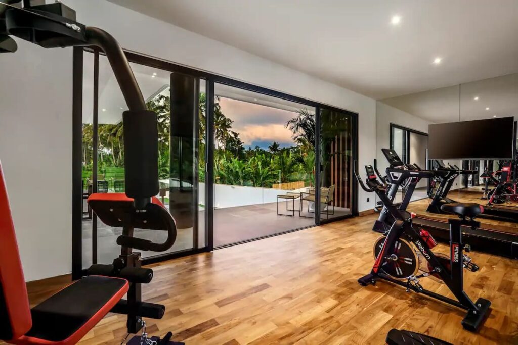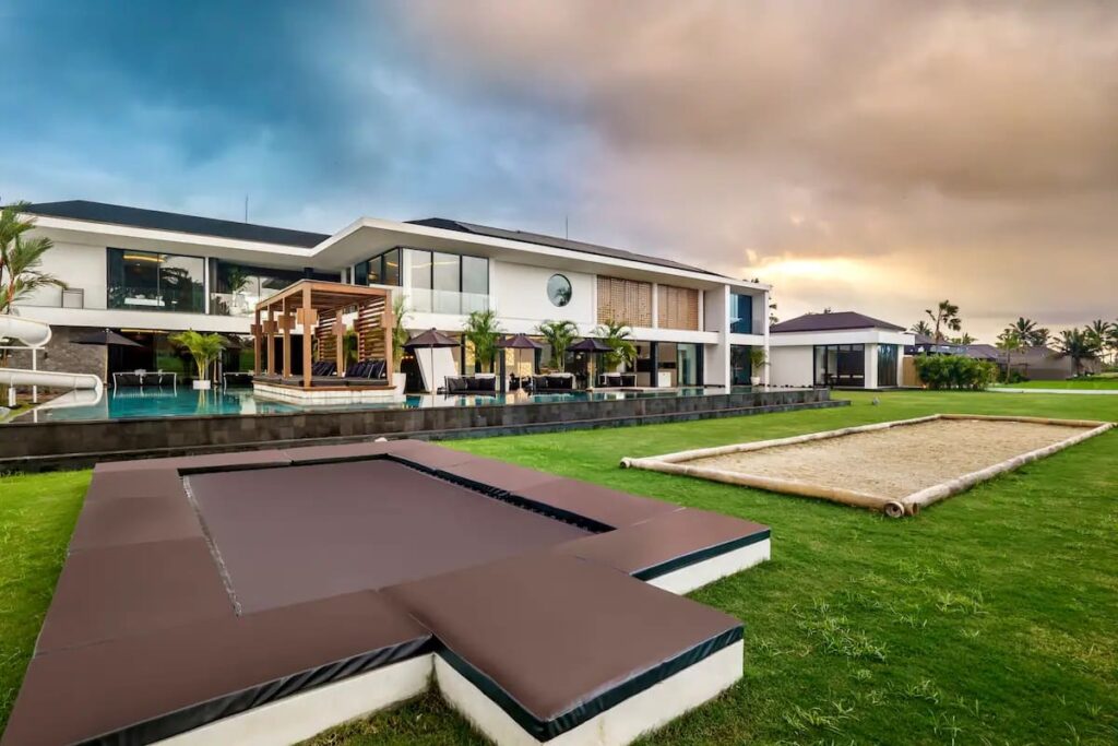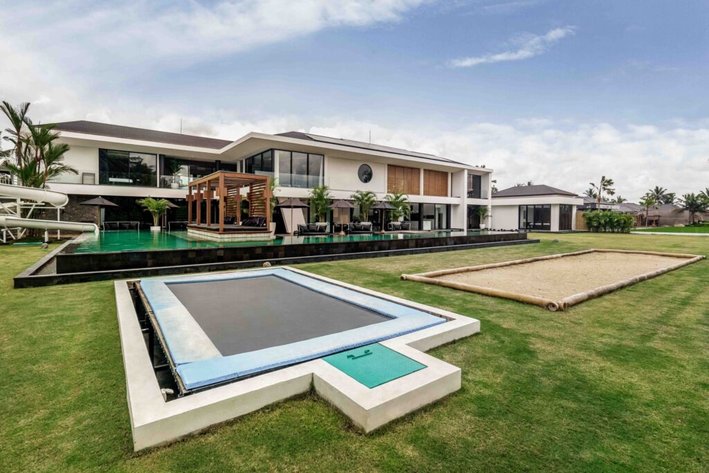 Find your perfect getaway in the villa that is sprawled on a massive land over 3500 m2 in total with exceptional features as one of the most advanced and comprehensive properties on the entire island, featuring modern and fully-equipped appliances that cater to every need and desire. This villa features a spacious living room integrated with the dining area and a fully-equipped modern kitchen overlooking a stunning panorama of the verdant surroundings, which beautifully contrasts against the monochrome decor. It boasts a fully-equipped gym, basketball, and badminton court, tennis court, tree house, water park, petanque court, trampoline, billiard table, private spa room, and outdoor cinema & cinema room, ensuring your fullest enjoyment with friends and family in the villa. One of the villa’s most distinctive characteristics is the water slide that descends from the upper level to the pool below, which offers a fun and rejuvenating activity. Additionally, the pool itself is a beautiful oasis with shimmering azure waters and abundant room for relaxation and basking in the sunshine. The villa comes with easy and good road access, and there is an adequate parking area located near the entrance.