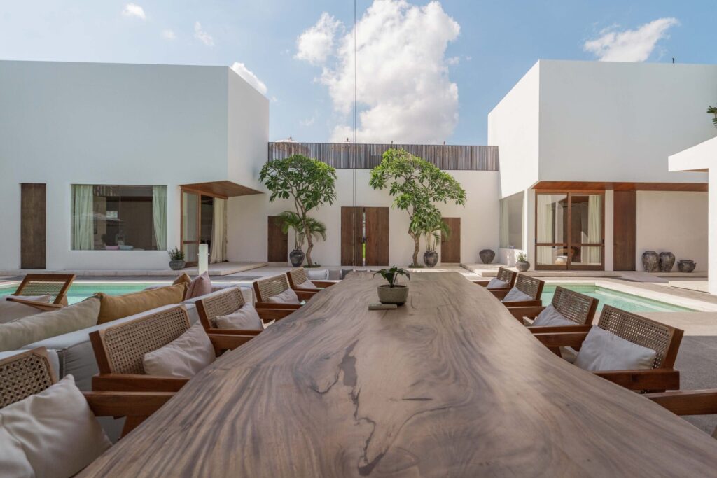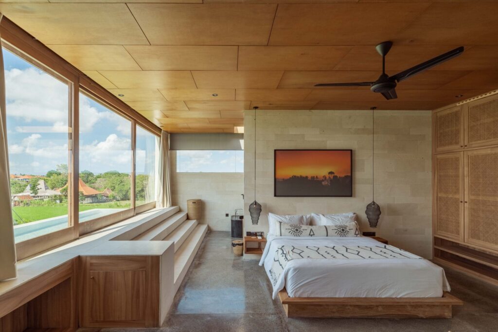 Feel the epitome of sophistication and elegance in the villa featuring a warm and minimalist design and offering ample living space and plenty of natural light. It boasts a generous open living area that flows with a dining space and a fully equipped kitchen with an elegant marble island surrounded by a verdant tropical garden and a generously sized swimming pool and an outdoor sunken lounge, providing an idyllic setting for unwinding and rejuvenation. The villa comprises well-lit six bedrooms, each of which is designed in a unique manner to provide spacious and private accommodation featuring elegant and roomy interiors that draw inspiration from natural and ethnic designs. Four of the bedrooms are located on the ground floor, surrounding the large swimming pool and living space. The other two bedrooms are located upstairs and are designed as suites with their own plunge pools and breathtaking views of the rice fields.
