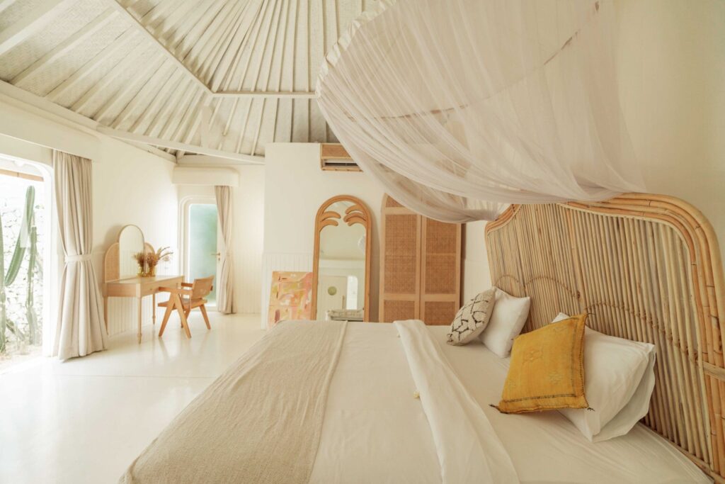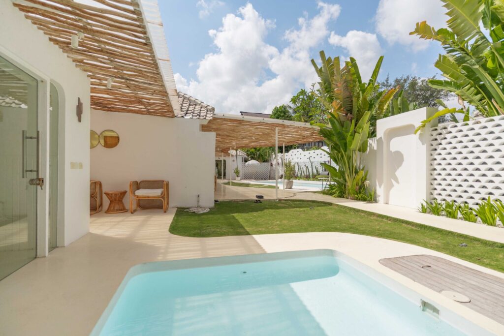 Indulge in tropical living at this exquisite villa, which offers a spacious outdoor area and convenient indoor space, including a separate bungalow with its own private pool. As you step inside, you’ll be greeted by a tastefully designed living area that flows seamlessly into the dining area and kitchen, the indoor space features a charming combination of white and earthy tones, creating a warm and bright atmosphere. Adjacent to the kitchen is a bar that provides a perfect spot for meals while enjoying the outdoor view. The outdoor area is equally impressive, boasting a long pool, lush garden, sun beds, and sandbox that make it a comfortable and enjoyable space for outdoor activities in tropical weather. The villa has a total of 6 bedrooms, with one located in the private bungalow and the remaining 5 spread throughout the main building. All of the bedrooms are beautifully furnished with modern amenities and have their own ensuite bathrooms.