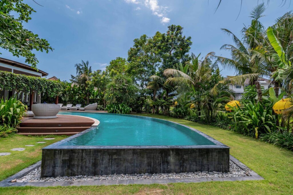 Set on a sprawling 2000 sqm of land, this magnificent property offers a truly immersive experience. As you enter, you’ll be greeted by a spacious living area complete with a dining area and a modern kitchen that seamlessly opens up, creating a harmonious flow between the indoor and outdoor spaces. This design allows for a seamless connection with nature, inviting tropical vibes to permeate throughout the villa. From the living area, you’ll enjoy breathtaking views of the outdoor space, which is adorned with a magnificent long swimming pool and a lush garden. The inviting atmosphere created by the pool and garden offers a tranquil oasis where you can relax and unwind, surrounded by the beauty of nature. The villa boasts five generously sized bedrooms, spread over an expansive 800 sqm building. Each bedroom is spacious and comes with its own ensuite bathroom, providing ultimate comfort and privacy. The design of the bedrooms complements the villa’s tropical aesthetic, incorporating natural elements and offering a soothing retreat after a day of exploration or relaxation. Whether you’re seeking a peaceful getaway or a luxurious retreat, this villa in Pererenan is a perfect choice.