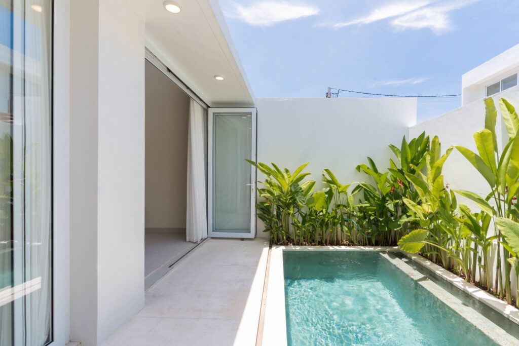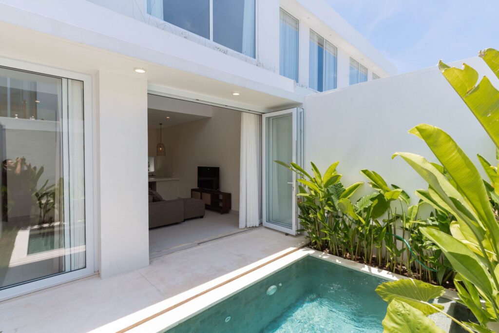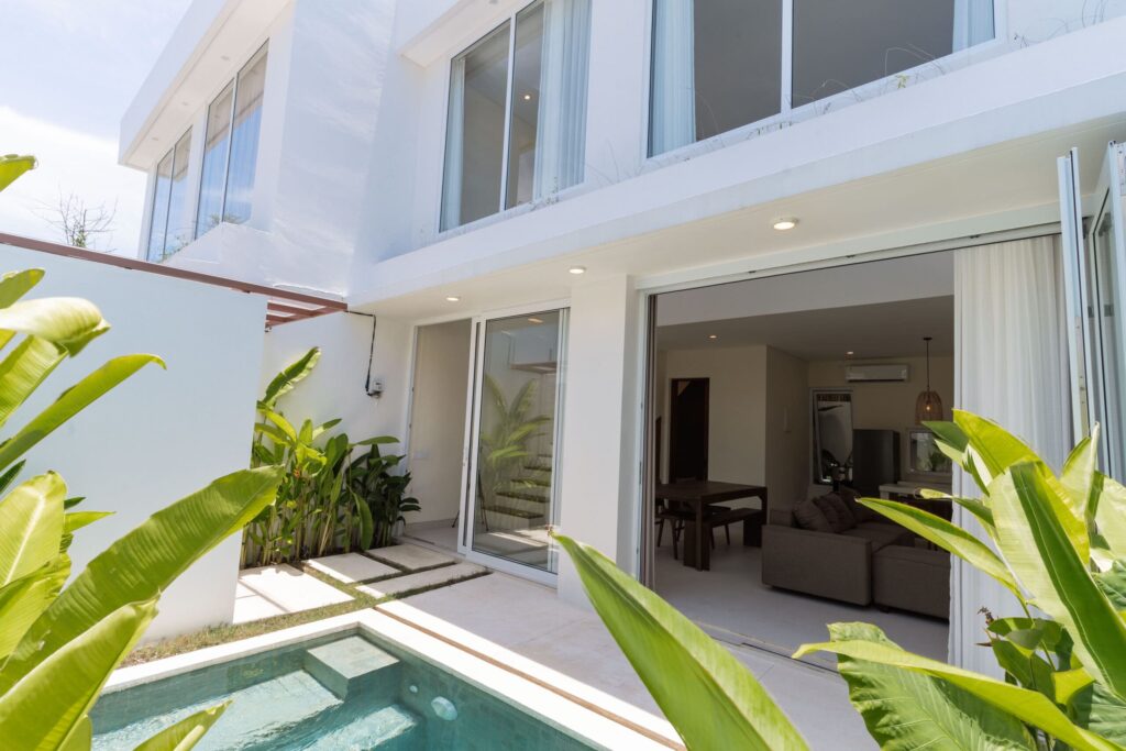Step inside and be enchanted by the loft’s modern minimalist design. An open-plan living area welcomes you with its spacious layout, seamlessly integrating the living room, dining area, and fully equipped kitchen. Large windows bathe the space in natural light and provide unobstructed views of the inviting swimming pool and lush green surroundings. Retreat to the comfort of one generously sized ensuite bedroom that is conveniently located on the second floor. This loft comes complete with a private parking area, accommodating two motorbikes, ensuring your convenience and security. Access to the complex is a breeze with a 3-meter-wide road, making arrivals and departures effortless.