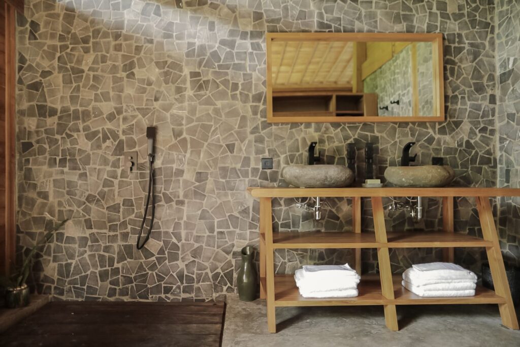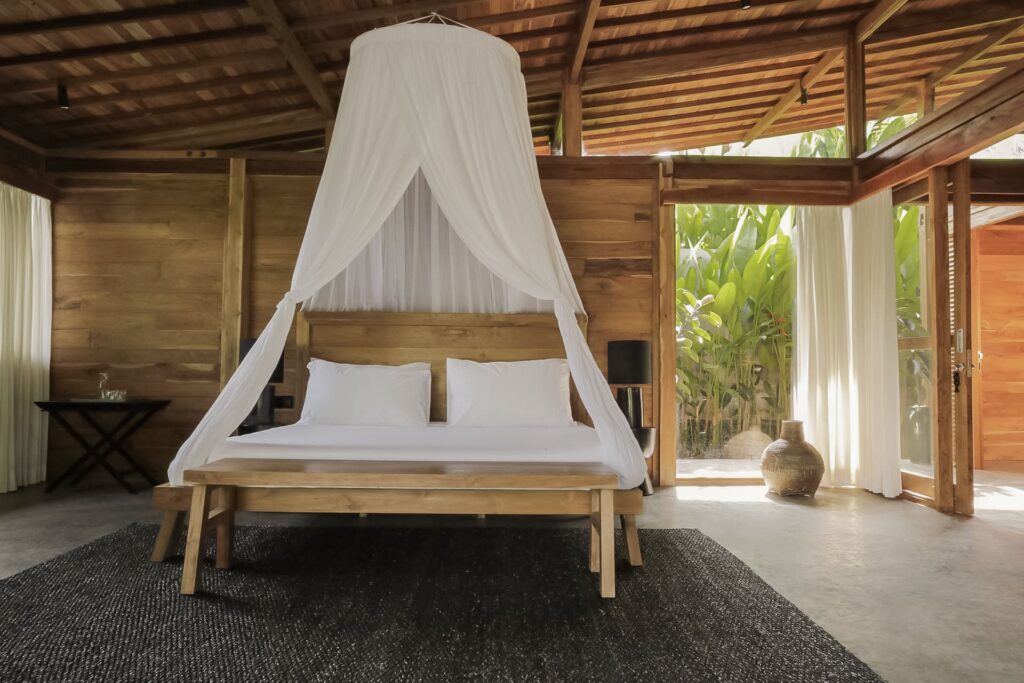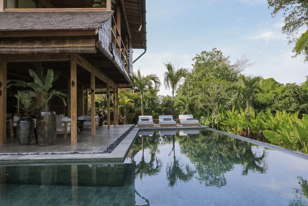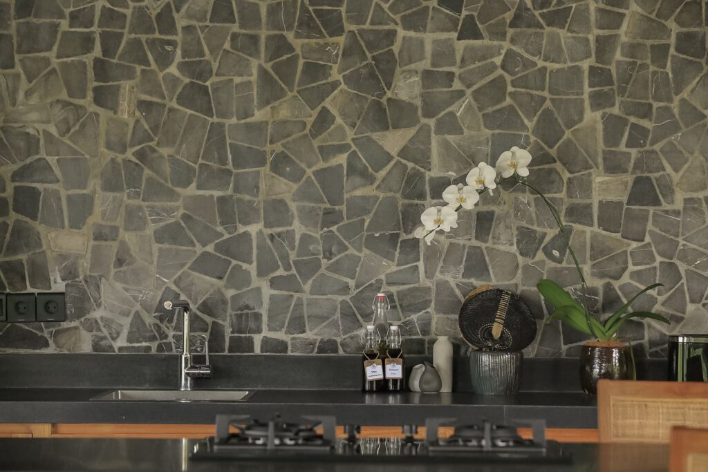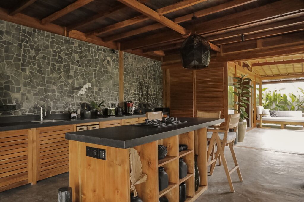 Ready for immediate enjoyment, this heavenly retreat is nestled in a tranquil setting and offers quick access to the beach while being surrounded by natural beauty. Upon entering the villa, you’ll be welcomed by an outdoor area featuring a lush tropical garden and an inviting L-shaped pool, with direct access to the open-plan living space. The communal area seamlessly incorporates the living and dining areas, as well as a fully equipped kitchen, all designed in earthy tones that blend harmoniously with the natural surroundings.