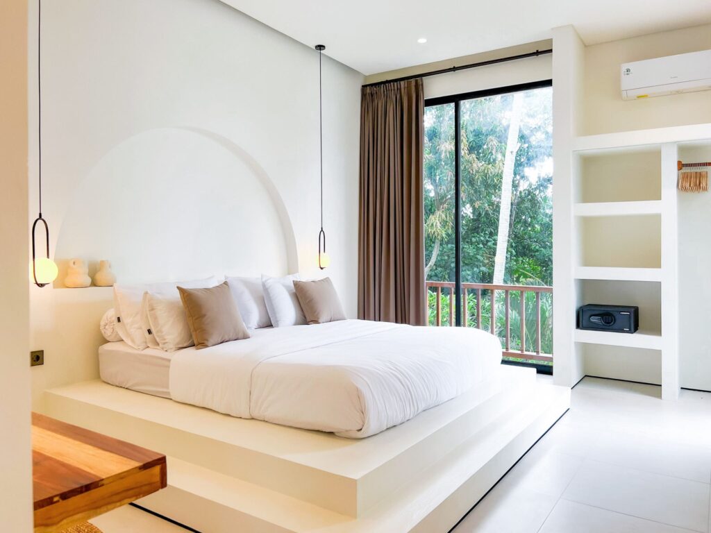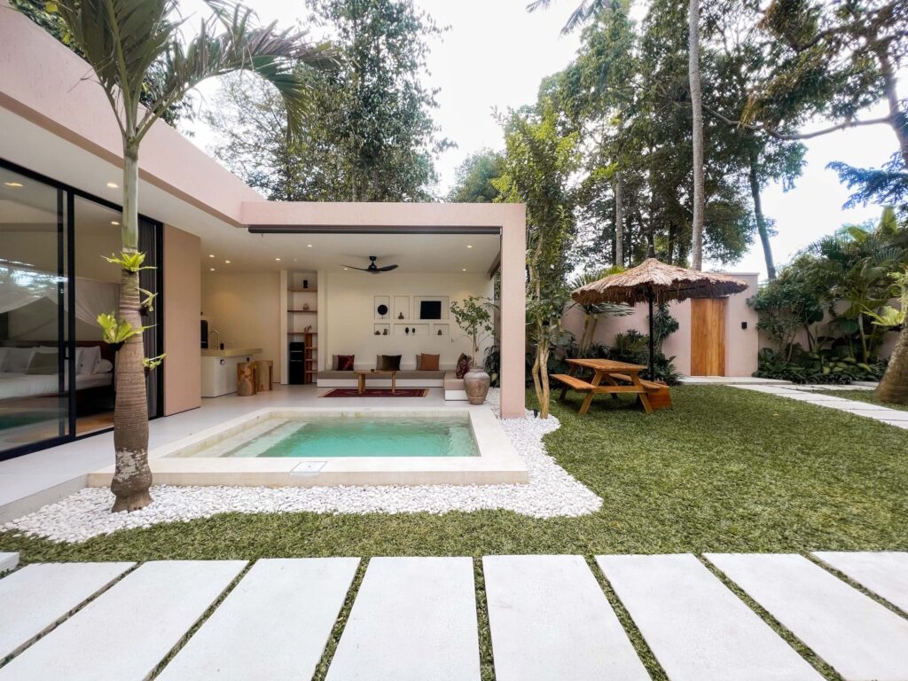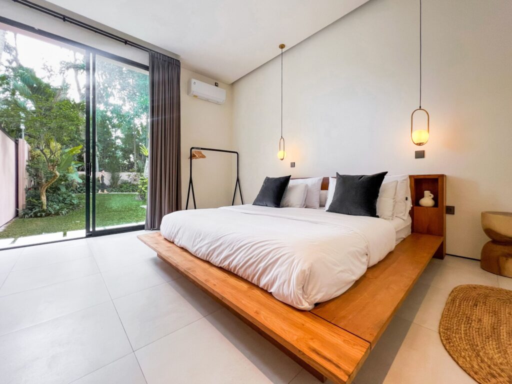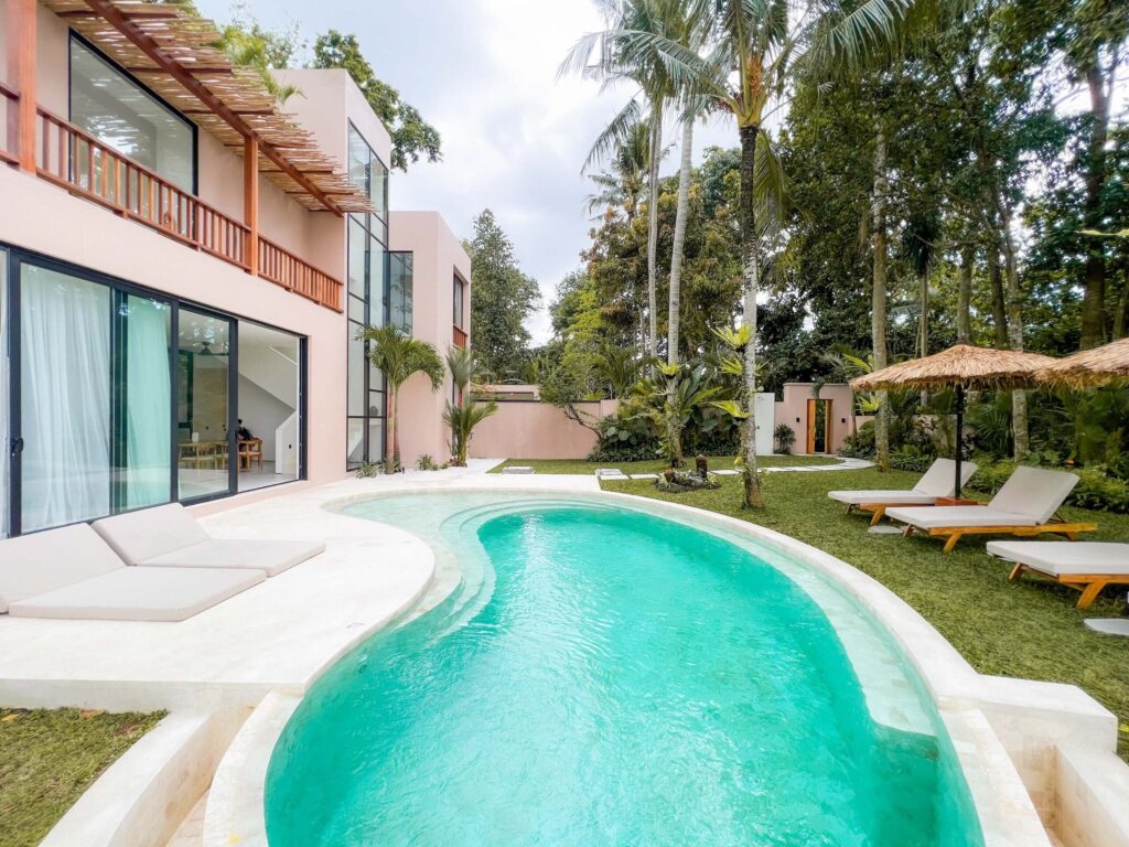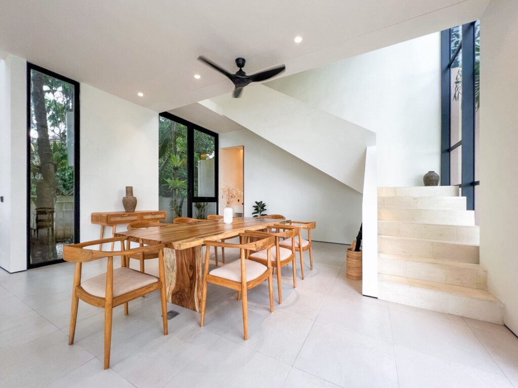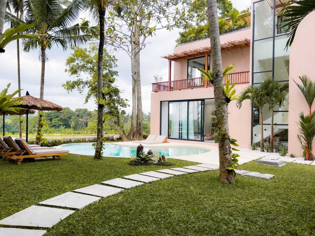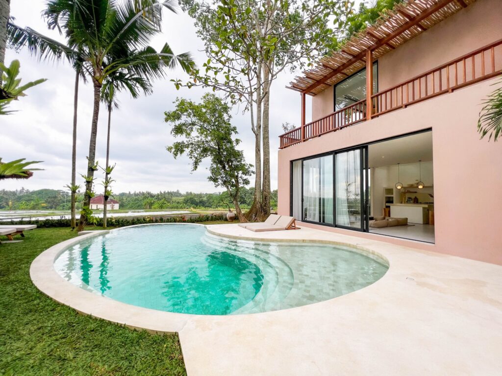 This villa consists of 2 units villa with 3-bedroom villa and 1-bedroom villa with a private swimming pool that is surrounded by a large garden with a scenic pathway. Upon entering, you’ll be greeted by an ample outdoor living space featuring a lush garden, an outdoor garden table, a private pool, and a semi-open living area. The enclosed living space includes a cozy sunken living room and a spacious kitchen equipped with modern amenities. Adjacent to this living space is a spacious one-bedroom suite with a private bathroom. The white concrete staircase leads to the remaining two-bedroom spaces. The primary bedroom boasts a sofa bench and a private balcony overlooking the rice fields, while the other bedroom suite offers a cozy bed space and a private en-suite bathroom. Each bedroom suite is designed with a minimalist style and soft white tones, creating an inviting and relaxing atmosphere. On the third floor, you’ll find a spacious rooftop terrace with a beautiful wooden pergola, making it an ideal spot for gathering with family and friends. Additionally, a side building with a transparent sliding door leads to another one-bedroom suite, featuring a minimalist design, a walk-in closet, and a semi-outdoor bathroom with a standing shower and a lovely bathtub. The villa also includes a security room, a storage area, and a laundry room, which is approximately 20 square meters. Overall, this villa is a stunning oasis in the rice field area where you can unplug and reset by the pool, enjoying the serene views of the rice paddies.