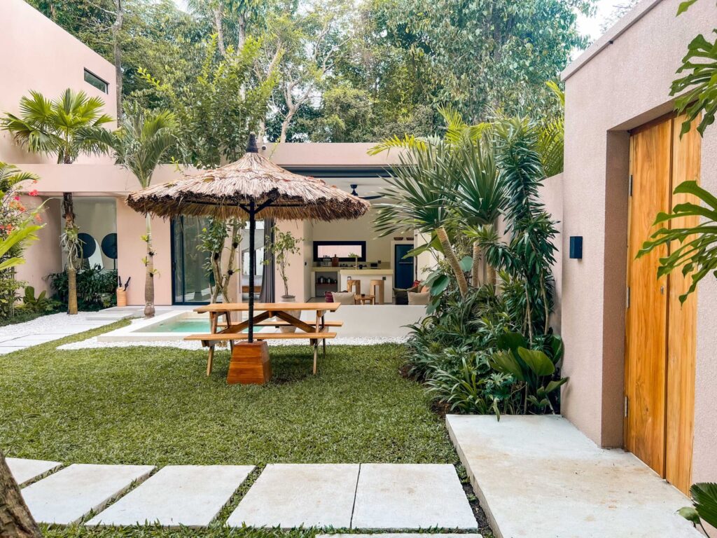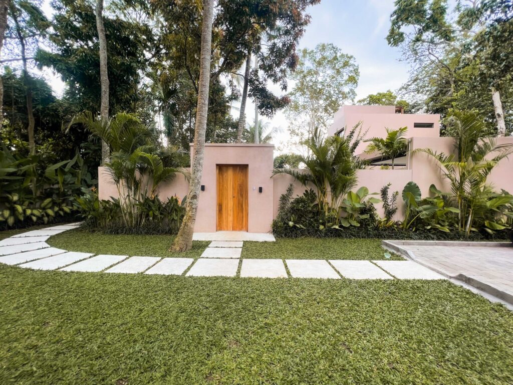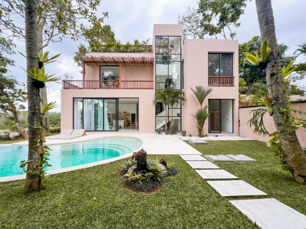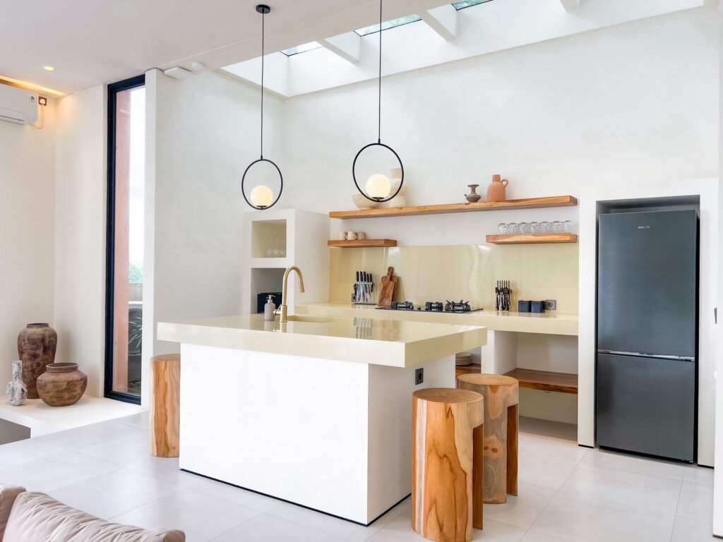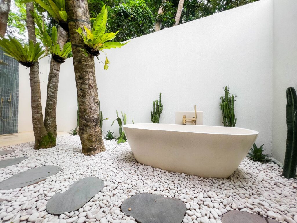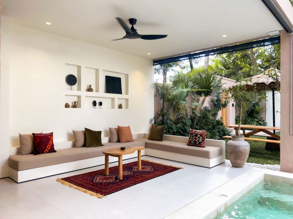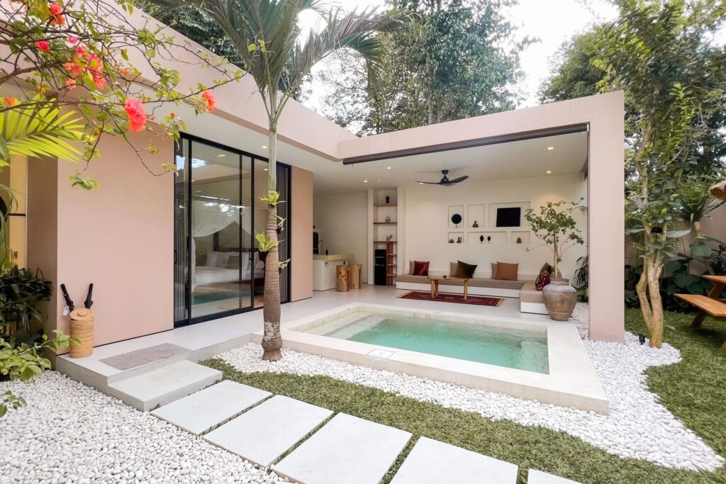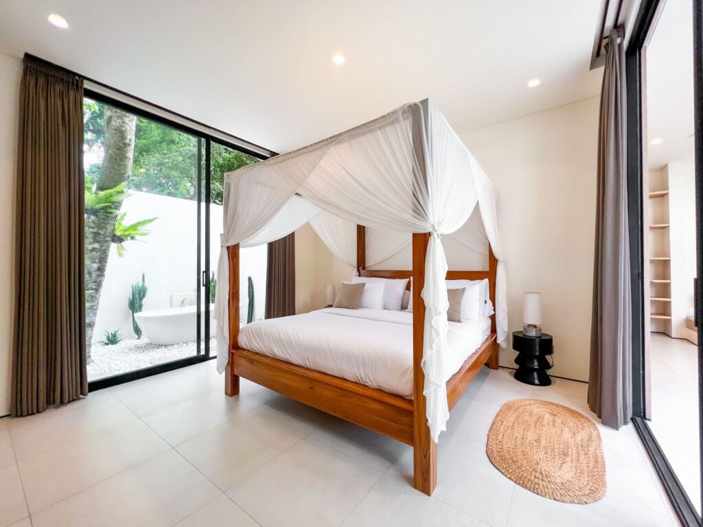This villa consists of 2 units villa with 3-bedroom villa and 1-bedroom villa with a private swimming pool that is surrounded by a large garden with a scenic pathway. Upon entering, you’ll be greeted by an ample outdoor living space featuring a lush garden, an outdoor garden table, a private pool, and a semi-open living area. The enclosed living space includes a cozy sunken living room and a spacious kitchen equipped with modern amenities. Adjacent to this living space is a spacious one-bedroom suite with a private bathroom. The white concrete staircase leads to the remaining two-bedroom spaces. The primary bedroom boasts a sofa bench and a private balcony overlooking the rice fields, while the other bedroom suite offers a cozy bed space and a private en-suite bathroom. Each bedroom suite is designed with a minimalist style and soft white tones, creating an inviting and relaxing atmosphere. On the third floor, you’ll find a spacious rooftop terrace with a beautiful wooden pergola, making it an ideal spot for gathering with family and friends. Additionally, a side building with a transparent sliding door leads to another one-bedroom suite, featuring a minimalist design, a walk-in closet, and a semi-outdoor bathroom with a standing shower and a lovely bathtub. The villa also includes a security room, a storage area, and a laundry room, which is approximately 20 square meters. Overall, this villa is a stunning oasis in the rice field area where you can unplug and reset by the pool, enjoying the serene views of the rice paddies.