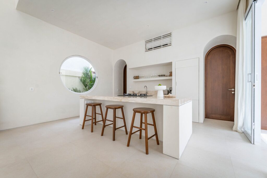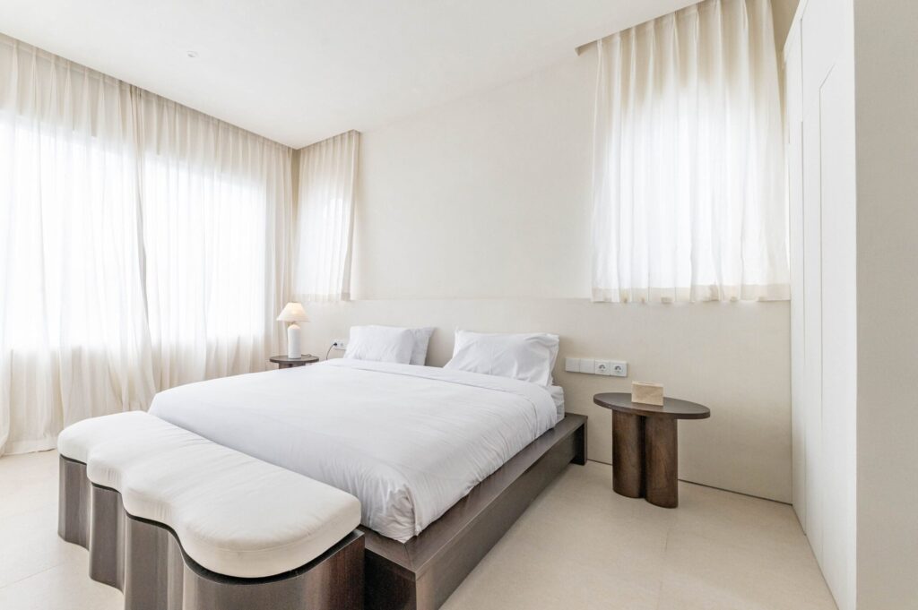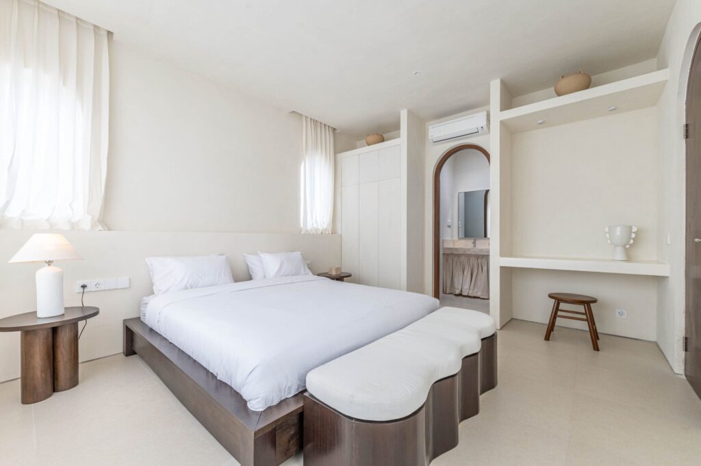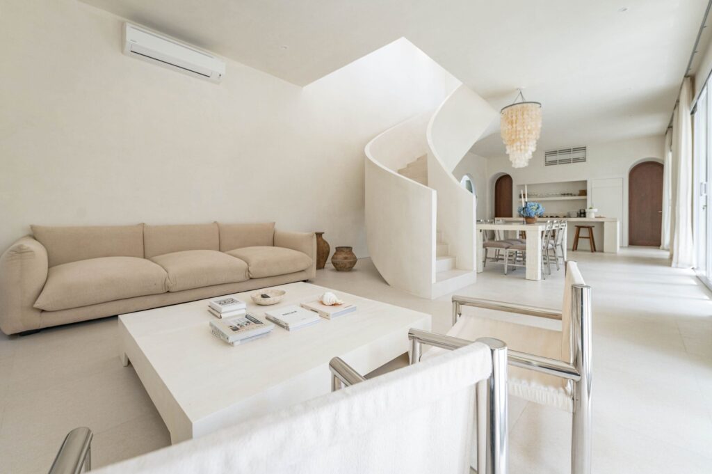 A modern oasis, this villa boasts two bedrooms with ensuite bathrooms and a pristine white exterior with charming arched doorways that open up to a serene and private courtyard. The courtyard features a sparkling plunge pool, perfect for relaxing under the warm sun. Inside, the villa offers a spacious and airy living area with large sliding glass doors that seamlessly blend indoor and outdoor living. The minimalist design is complemented by a soothing neutral color palette, making the space feel both luxurious and inviting. The stunning, sculptural staircase is a centerpiece of the villa, leading to the upper levels with grace and style. The dining area is beautifully appointed with a large table, perfect for gatherings, and is highlighted by an exquisite chandelier that adds a touch of elegance to the space. The room is filled with natural light, enhancing the airy, open atmosphere.