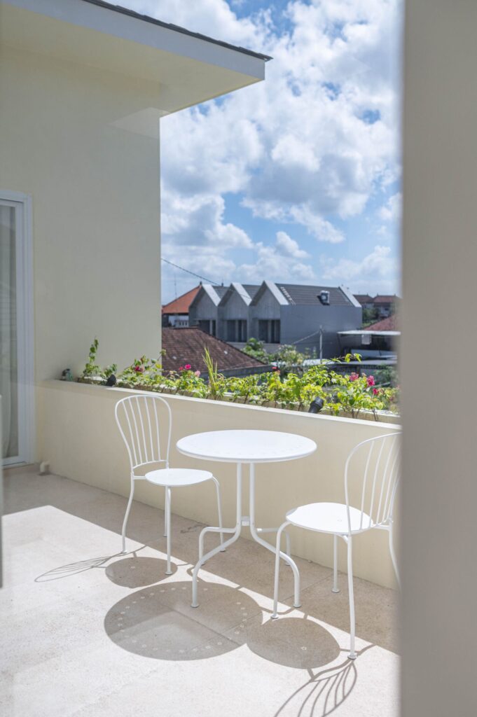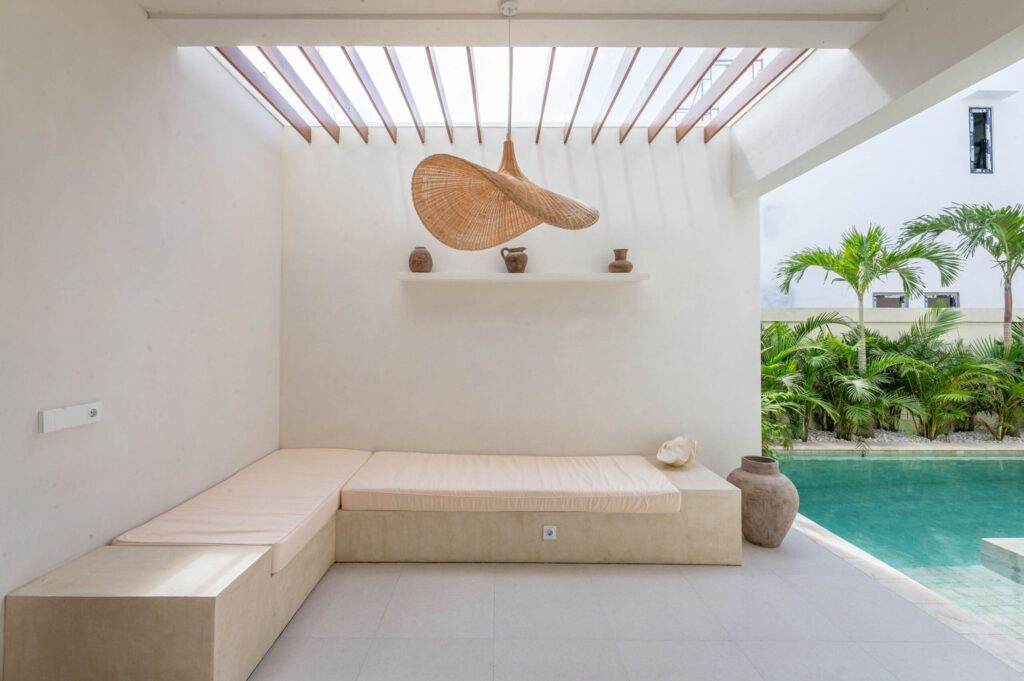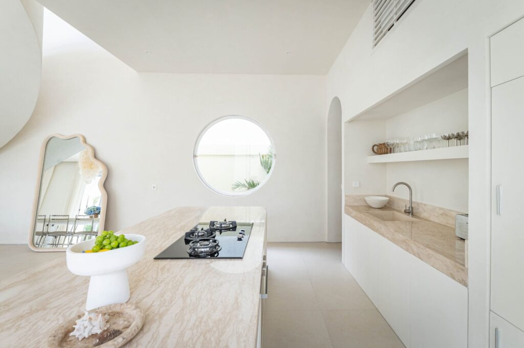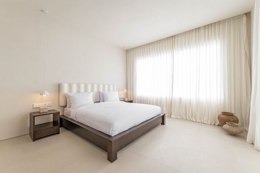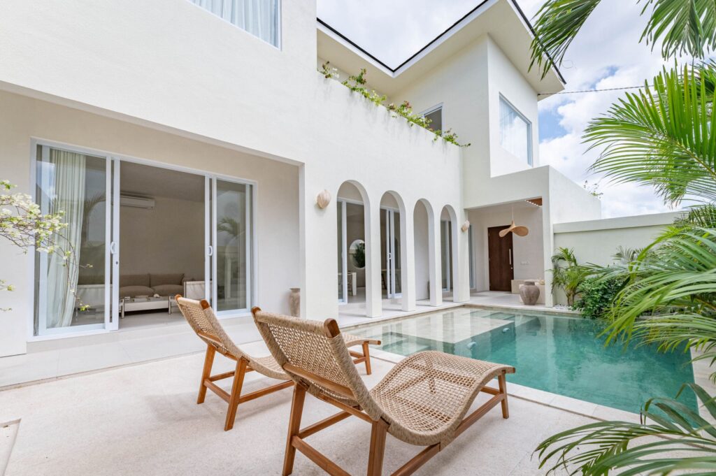 A modern oasis, this villa boasts two bedrooms with ensuite bathrooms and a pristine white exterior with charming arched doorways that open up to a serene and private courtyard. The courtyard features a sparkling plunge pool, perfect for relaxing under the warm sun. Inside, the villa offers a spacious and airy living area with large sliding glass doors that seamlessly blend indoor and outdoor living. The minimalist design is complemented by a soothing neutral color palette, making the space feel both luxurious and inviting. The stunning, sculptural staircase is a centerpiece of the villa, leading to the upper levels with grace and style. The dining area is beautifully appointed with a large table, perfect for gatherings, and is highlighted by an exquisite chandelier that adds a touch of elegance to the space. The room is filled with natural light, enhancing the airy, open atmosphere.