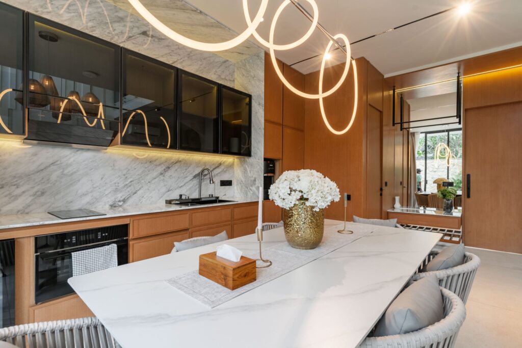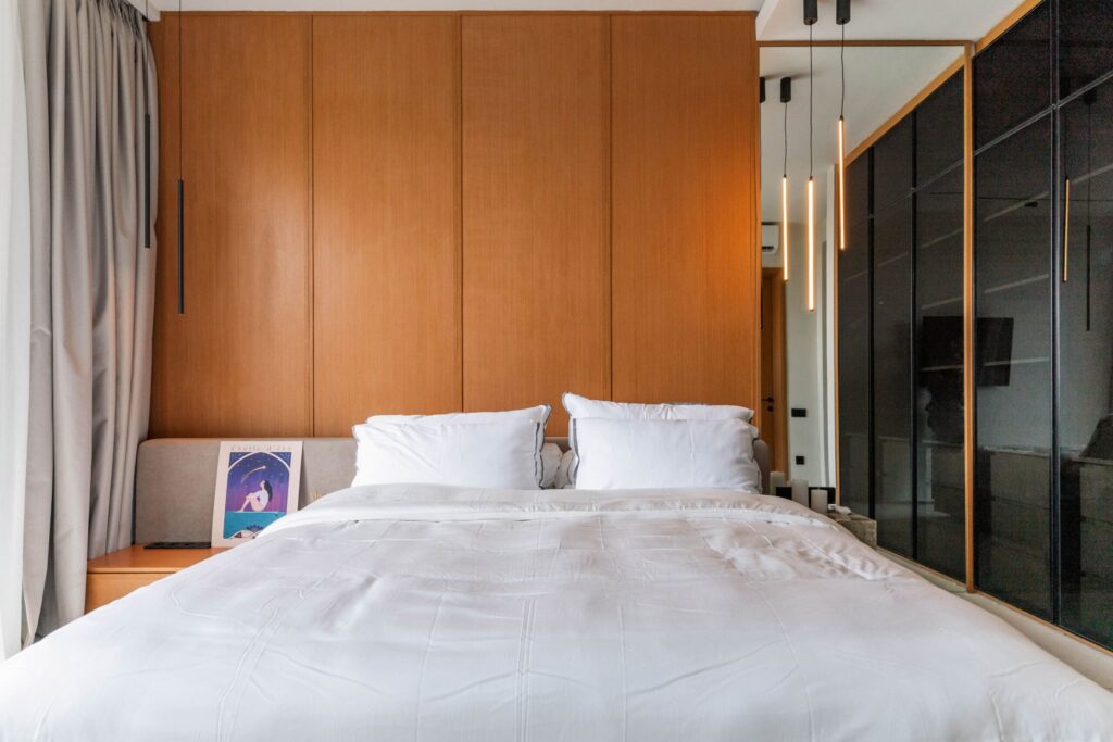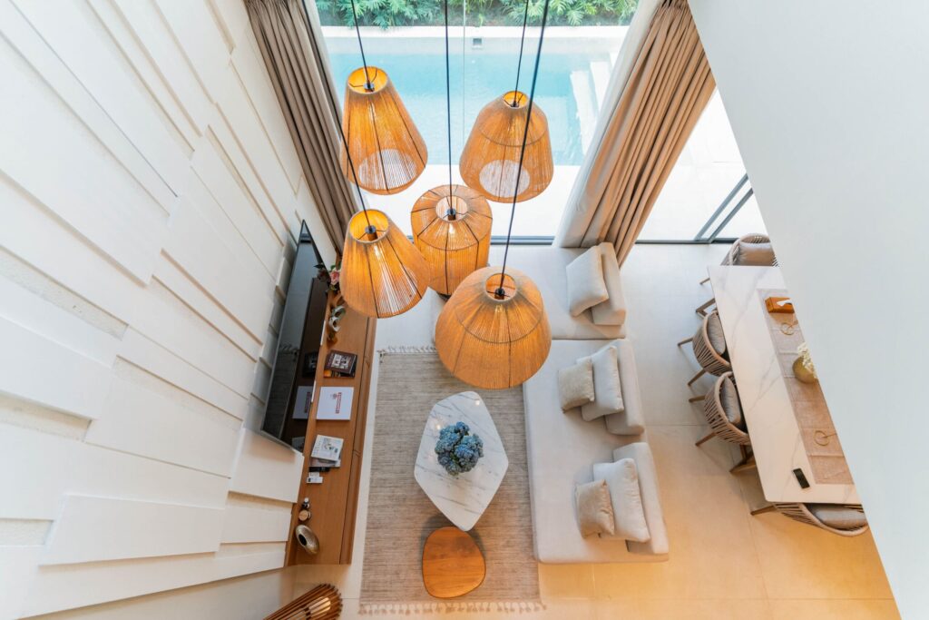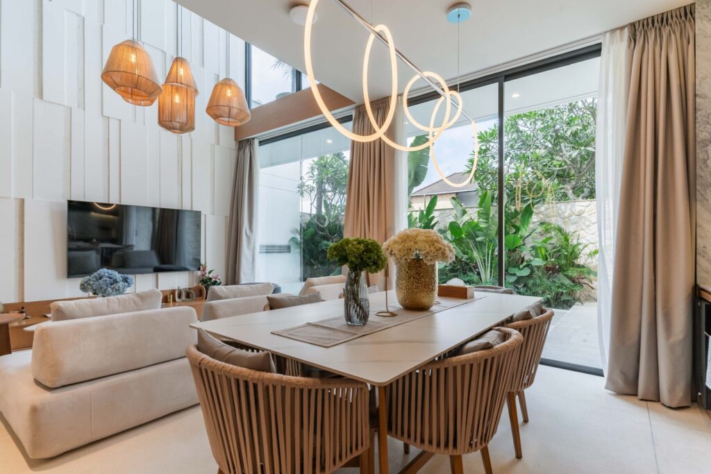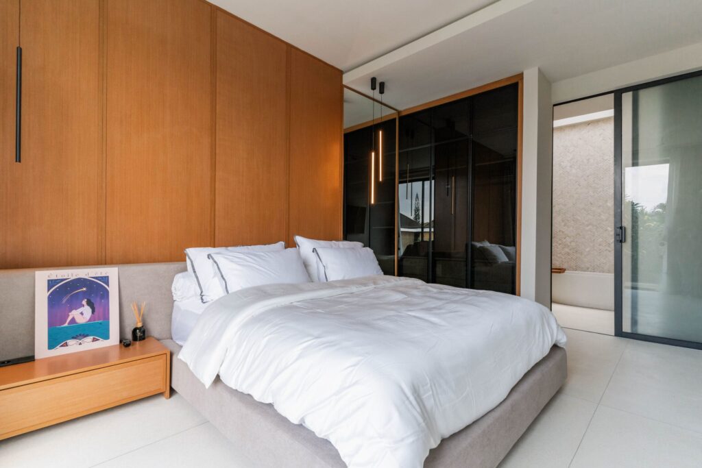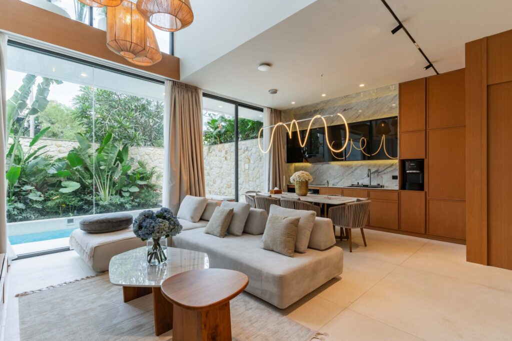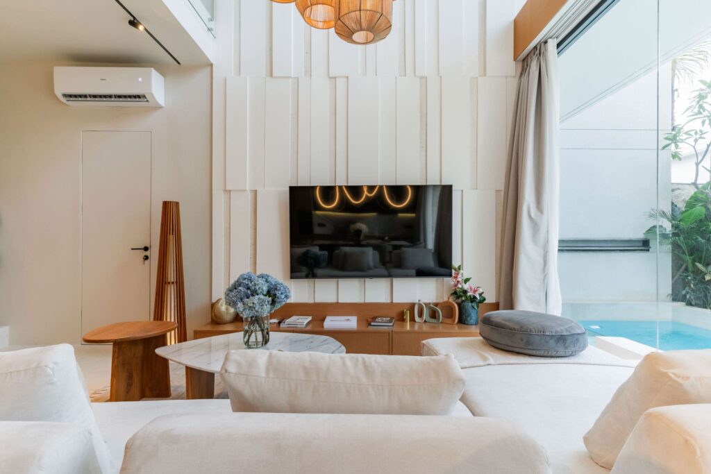 This luxurious villa boasts a spacious double-height living room, two generously sized bedrooms with King-size beds, two beautifully designed bathrooms with branded sanitary ware, and two open-air baths. The fully equipped kitchen features a dining area for six, complete with a sink, refrigerator, hob cooktop, and microwave. With a ceiling height of 2.9 meters, the villa offers a grand and airy atmosphere. Entertainment is provided by Samsung 4K TVs (75″ in the living room and 55″ in the bedrooms), while the smart home system includes automatic curtains and advanced lighting. Each room is air-conditioned for year-round comfort, and the villa has its own boiler for hot water and soundproofing for privacy. The private swimming pool, measuring 2.9 x 8 meters, has a stylish glass edge, and there’s a dedicated recreation area with a hearth and multicolored lights to create various ambiance scenarios. Parking for two bikes is available within the protected area, ensuring vehicle safety. This villa perfectly blends luxury, comfort, and modern amenities, making it an ideal choice for those seeking a premium lifestyle in the heart of Canggu.