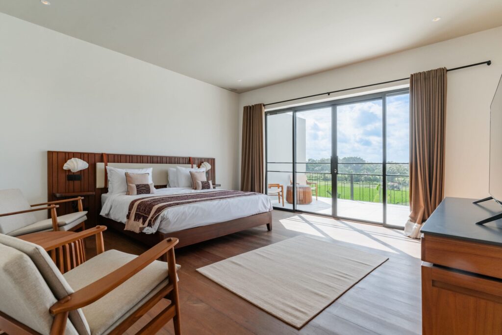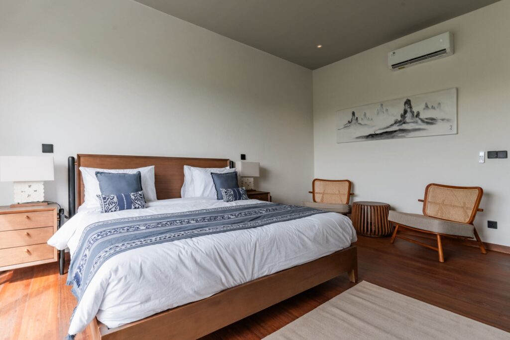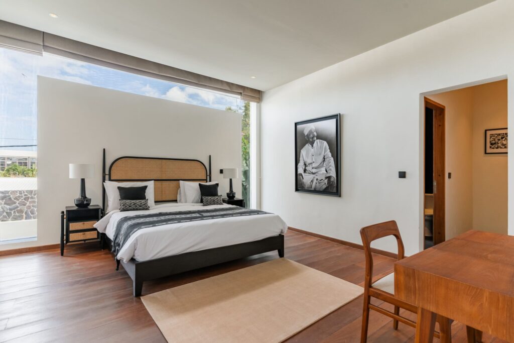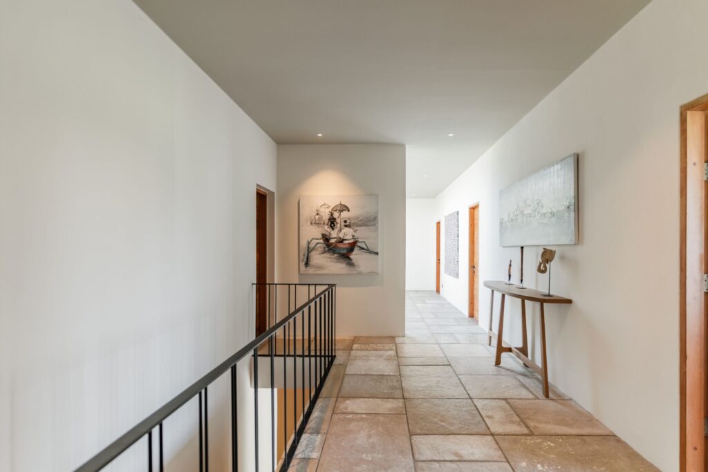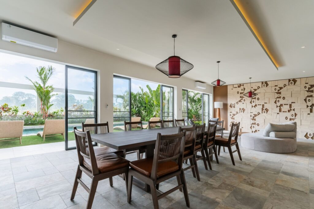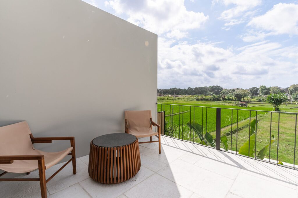 This Tropical Minimalist villa features six spacious bedrooms, each with its own en-suite bathroom. Five of these bedrooms are located on the second floor, each offering access to a balcony, while the sixth bedroom is conveniently situated on the ground floor. The villa’s enclosed living room provides a comfortable space to relax, complemented by a fully equipped kitchen and a dining area. A cozy chilling spot near the stairs adds an extra touch of comfort. Stepping outside, you’ll find a sparkling swimming pool surrounded by lush greenery, perfect for unwinding. The outdoor dining area is ideal for BBQs, where you can enjoy meals with your family while taking in the serene views of the nearby paddies. The property also includes parking space for one car and two bikes, ensuring convenience during your stay. This villa in Bumbak Dauh combines tropical elegance with modern comforts, making it an excellent choice for those seeking a peaceful yet accessible retreat in Bali.