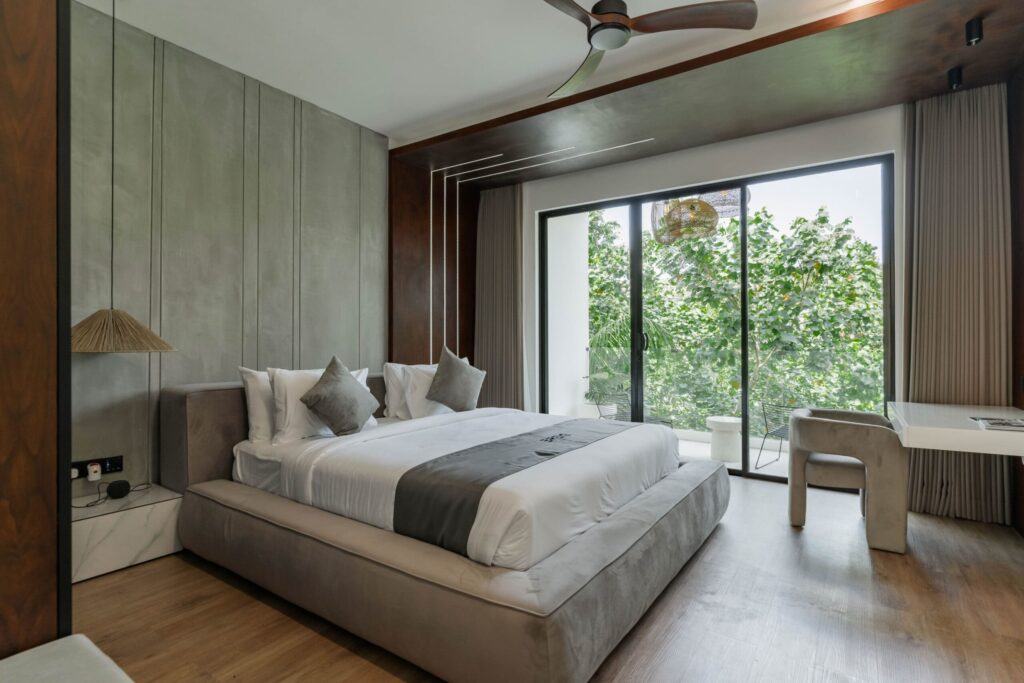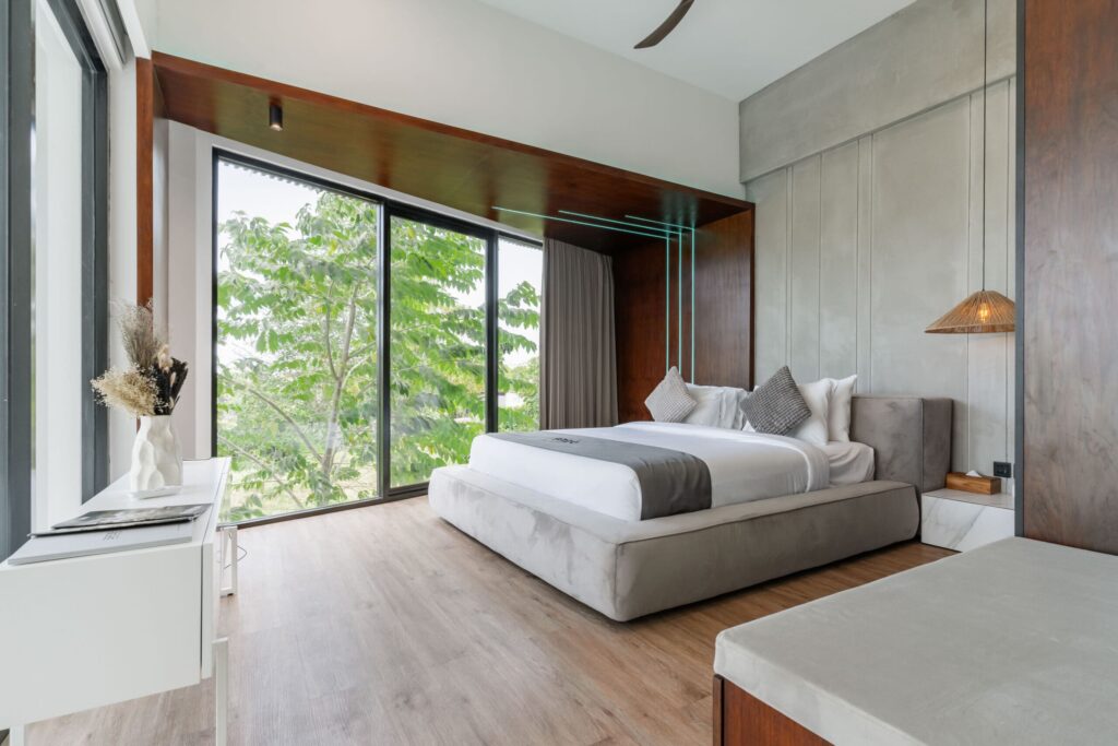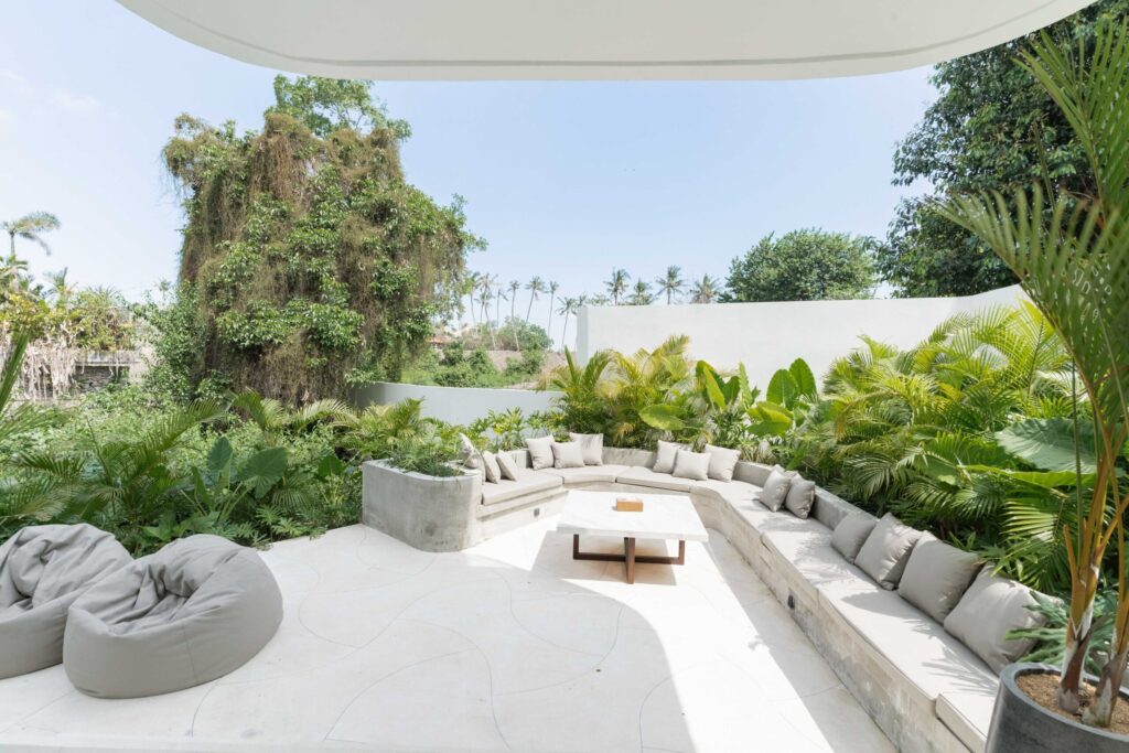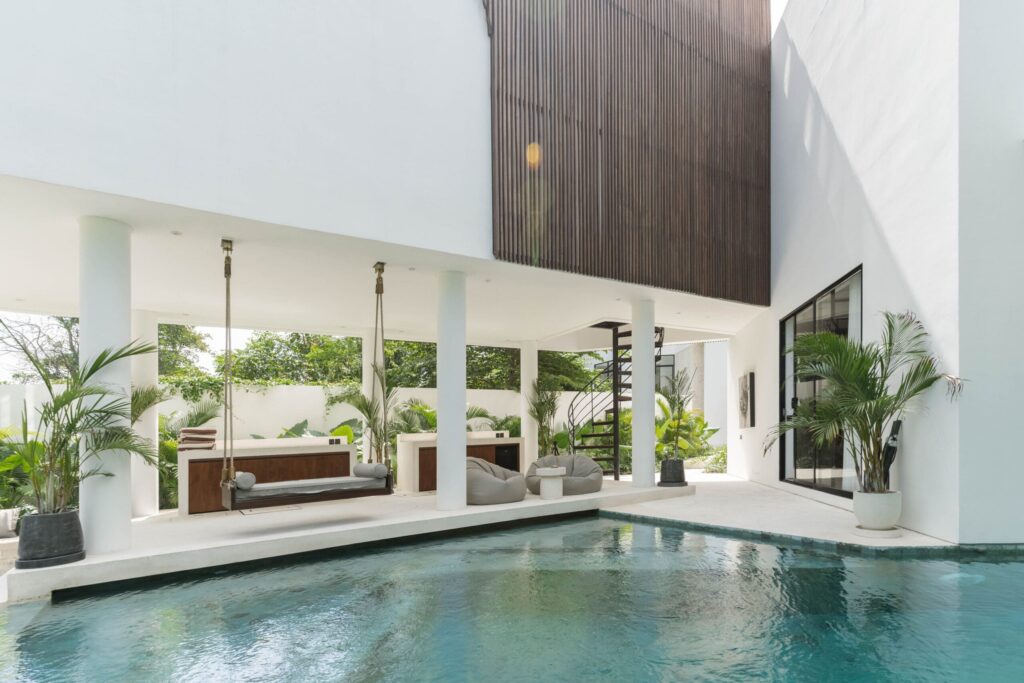 This tropical minimalist-style villa features five spacious bedrooms, housed within two separate buildings. Each bedroom is a private retreat, complete with its own en-suite bathroom, ensuring comfort and privacy for a large family or group of friends. The true centerpiece of this home is the expansive and unique living room. This bright and airy space seamlessly integrates a dining zone with a kitchen island, a modern sunken lounge area, and classic sofas near a cozy library nook. Every corner of this living room is thoughtfully designed, marrying aesthetics with functionality, creating an environment that is as beautiful as it is comfortable. Step outside, and you’ll find yourself in a tropical garden brimming with rich greenery, offering cool respite on warm tropical days. The garden leads to a stunning infinity pool that seemingly merges with the river view, providing a serene and breathtaking backdrop for relaxation. This villa is more than just a home; it’s a sanctuary where every detail has been crafted to offer a luxurious and peaceful living experience in one of Bali’s most desirable locations.
