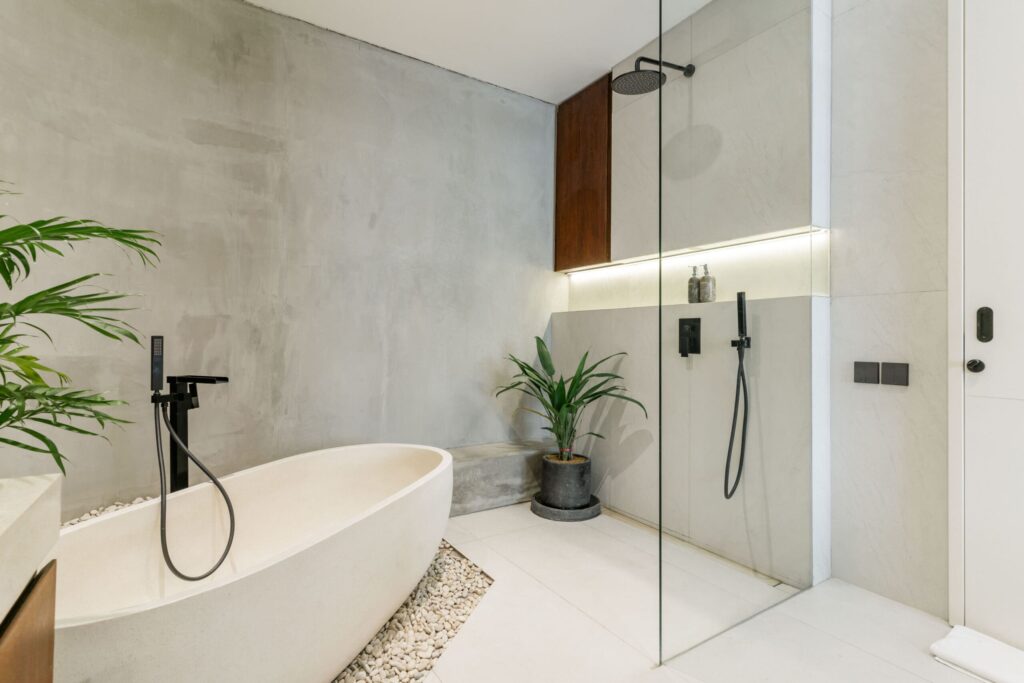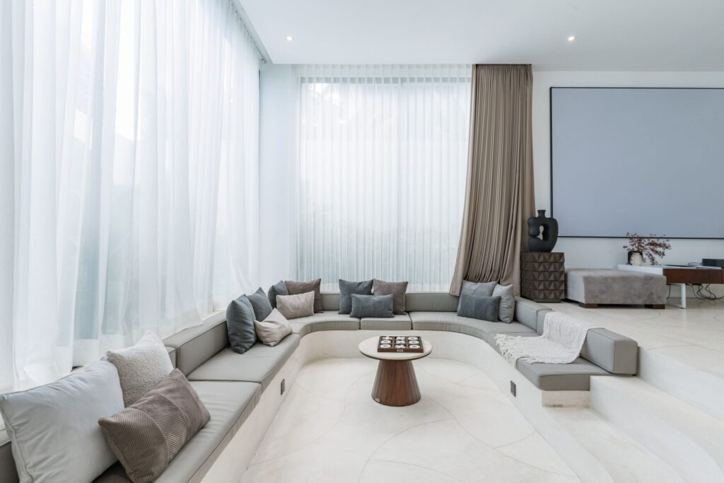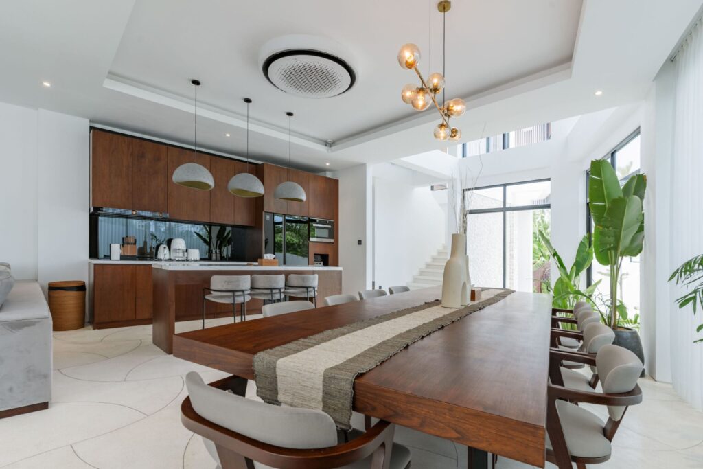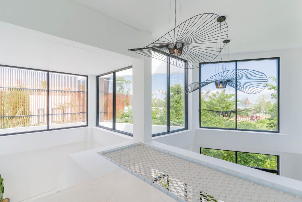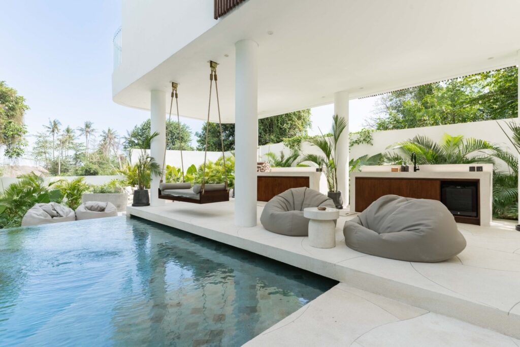 This tropical minimalist-style villa features five spacious bedrooms, housed within two separate buildings. Each bedroom is a private retreat, complete with its own en-suite bathroom, ensuring comfort and privacy for a large family or group of friends. The true centerpiece of this home is the expansive and unique living room. This bright and airy space seamlessly integrates a dining zone with a kitchen island, a modern sunken lounge area, and classic sofas near a cozy library nook. Every corner of this living room is thoughtfully designed, marrying aesthetics with functionality, creating an environment that is as beautiful as it is comfortable. Step outside, and you’ll find yourself in a tropical garden brimming with rich greenery, offering cool respite on warm tropical days. The garden leads to a stunning infinity pool that seemingly merges with the river view, providing a serene and breathtaking backdrop for relaxation. This villa is more than just a home; it’s a sanctuary where every detail has been crafted to offer a luxurious and peaceful living experience in one of Bali’s most desirable locations.