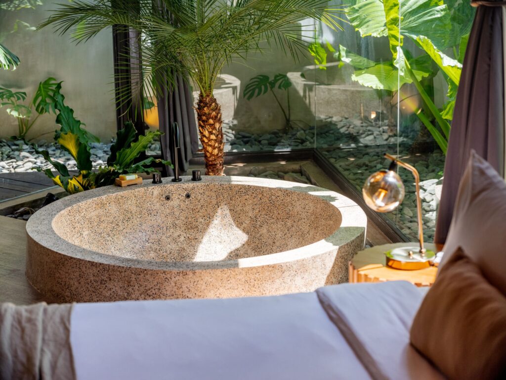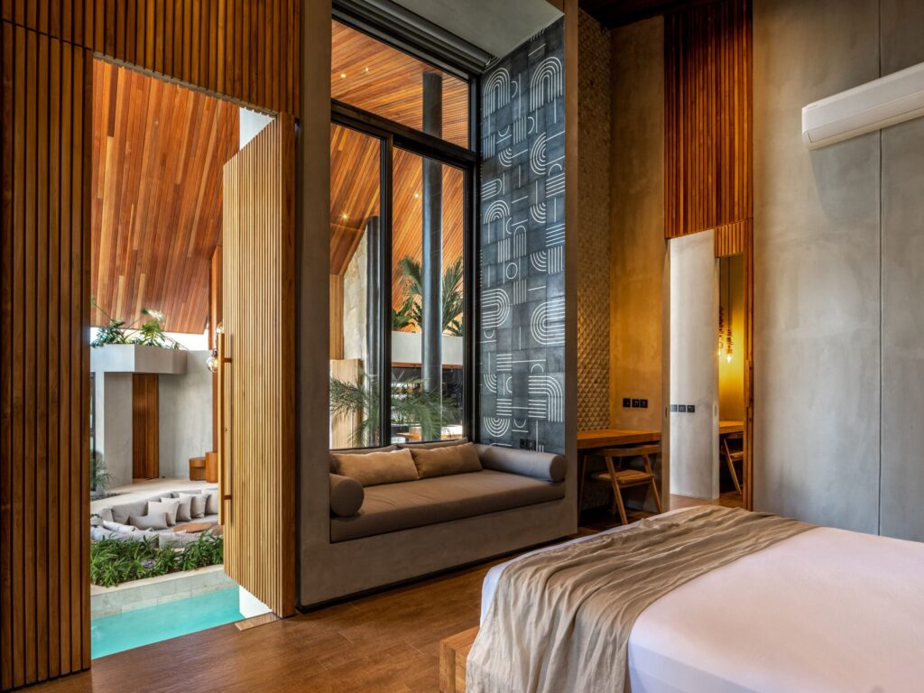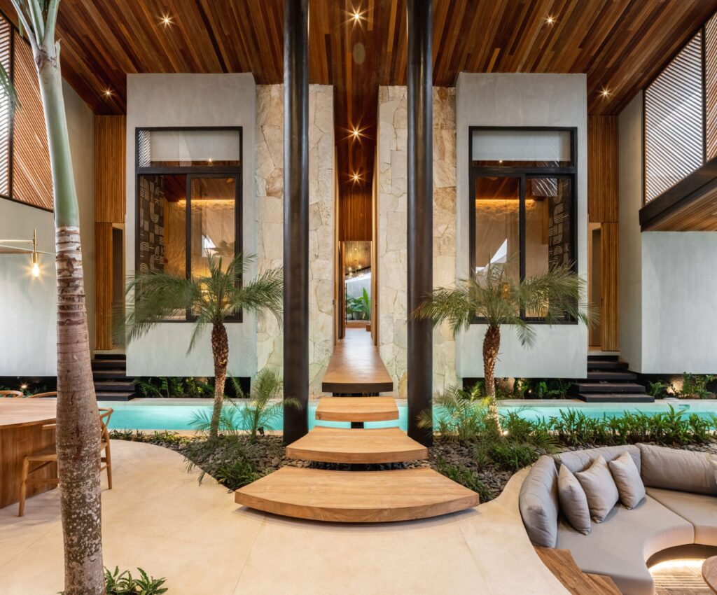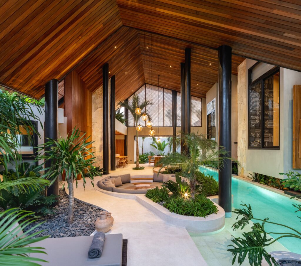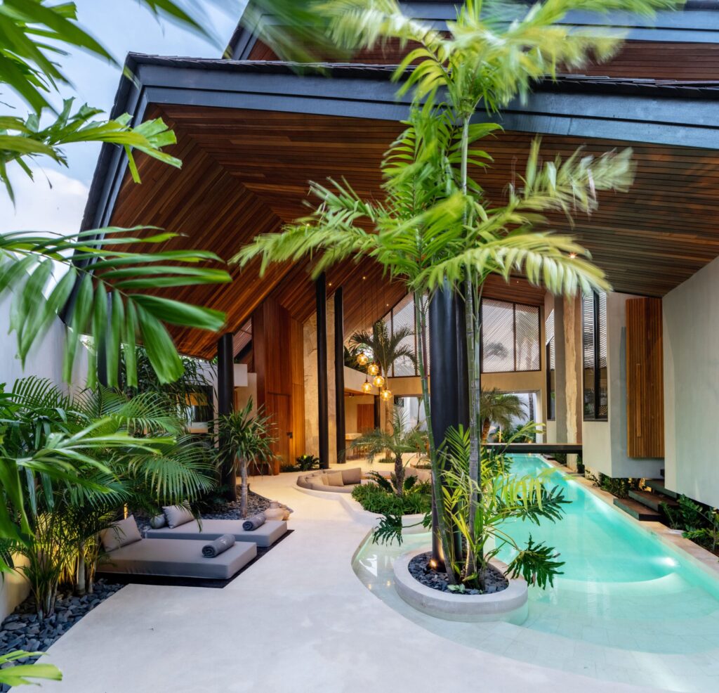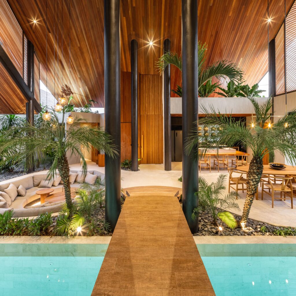 This exquisite modern villa, crafted by the acclaimed Biombo Architects, is part of a private compound featuring three villas. It boasts 3 well-appointed bedrooms, each with its own private ensuite bathroom, providing a serene and cozy haven. True to Biombo Architects’ signature style of merging nature with architecture, the villa effortlessly incorporates natural elements into its interiors, fostering a peaceful and revitalizing ambiance. A notable highlight is the villa’s expansive roof, an elegant canopy of aged wooden tiles that envelops the entire structure, adding to its refined yet inviting charm. The villa’s distinct diagonal layout across the plot optimizes the pool’s length, which is mostly integrated within the indoor space, enhancing both the spaciousness of the living areas and offering extended, uninterrupted views from the entrance to the villa’s focal point—a sunken circular bathtub. Blending refined design, luxurious features, and a deep connection with nature, this villa delivers a unique and serene living experience that harmoniously combines style, comfort, and tropical allure.
