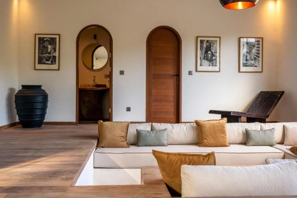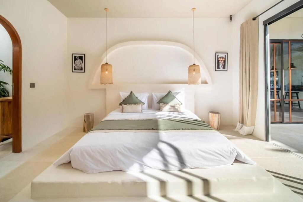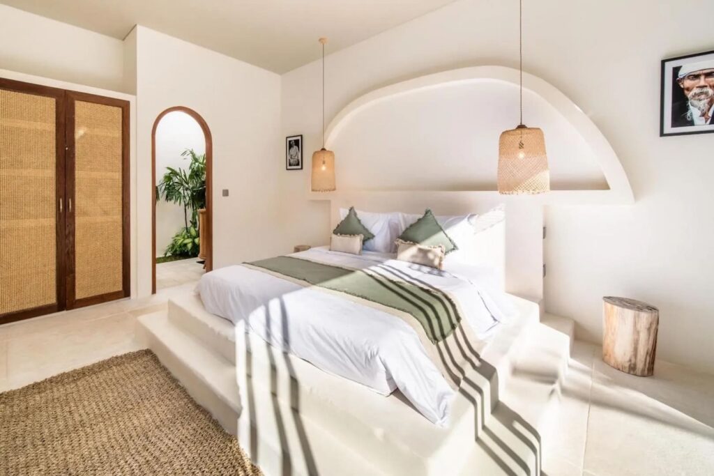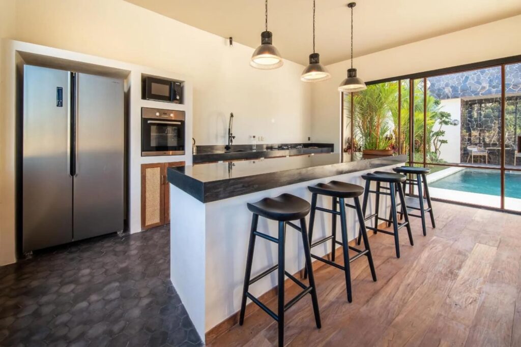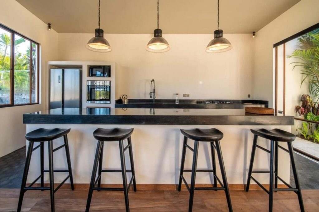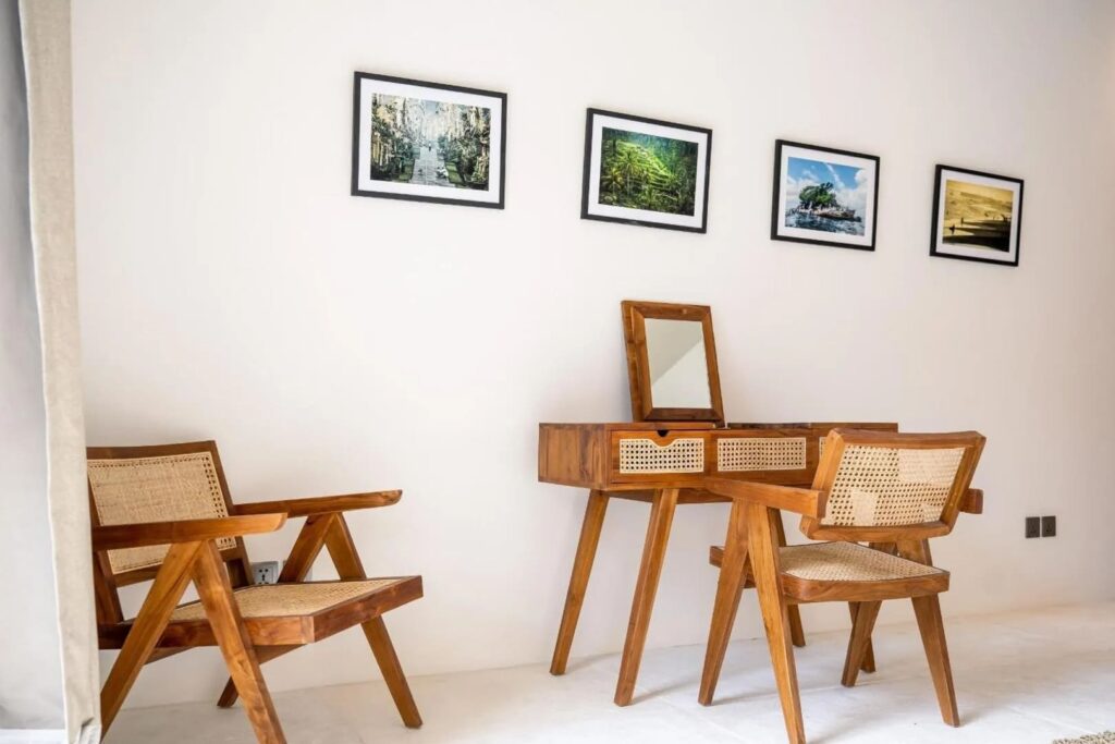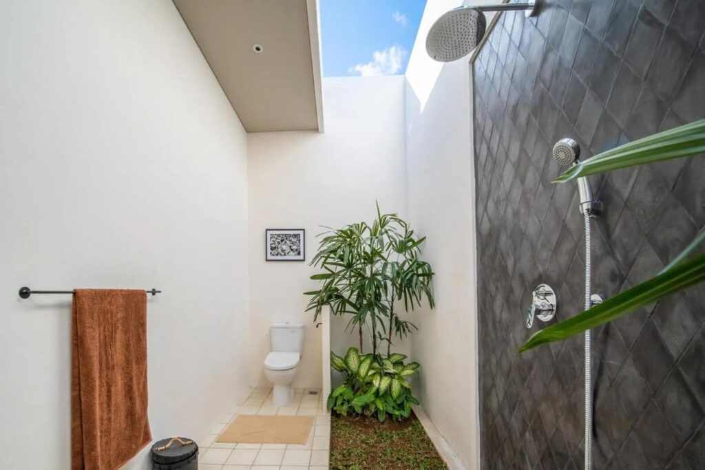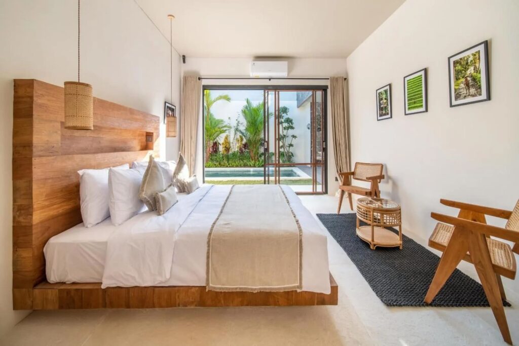Designed with both comfort and style in mind, this villa is the ultimate retreat. It features two spacious bedrooms, each with its own ensuite bathroom, ensuring privacy and comfort. The design blends modern elements with natural touches, including wooden furniture that beautifully complements the lush tropical surroundings. The fully equipped kitchen and dining area provide an ideal space for preparing and enjoying meals, while the sunken living area, with expansive glass walls, brings in abundant natural light, creating a warm, inviting atmosphere. Step outside to discover a stunning long pool surrounded by lush greenery and sunbeds—perfect for relaxing and soaking up the Bali sunshine. Whether you’re looking for a peaceful escape or an unforgettable Bali adventure, this villa offers the ideal setting.
