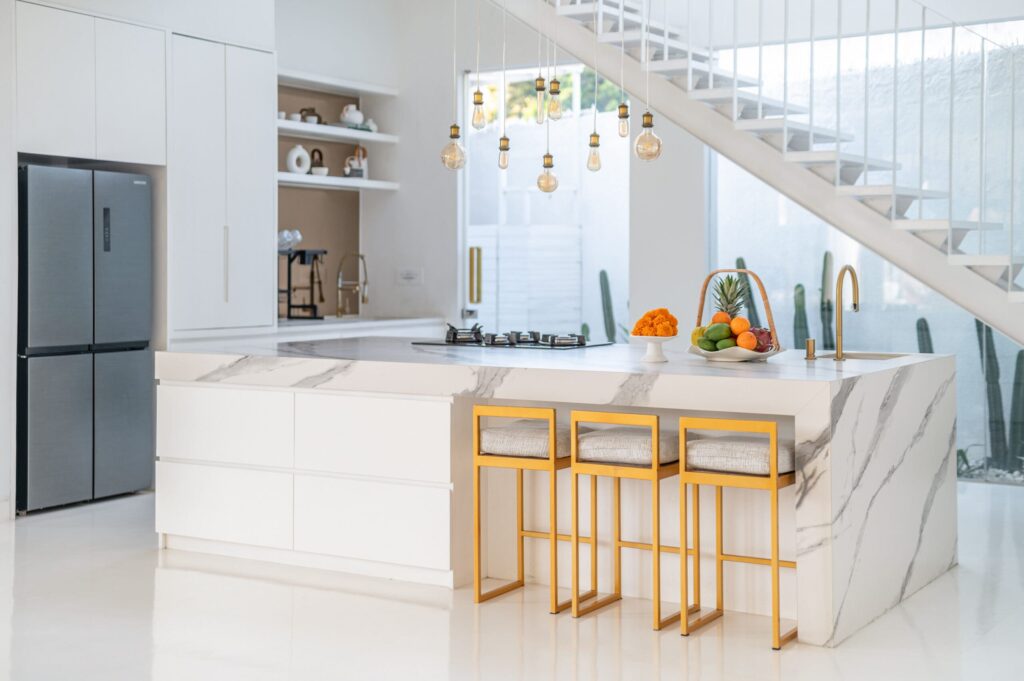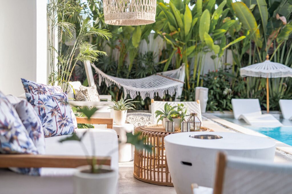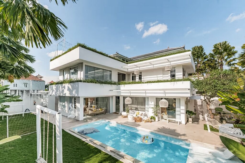 Nestled within a gated and secure complex in Canggu, this exquisite villa features 5 elegantly designed bedrooms and 4 bathrooms and 1 powder room, each showcasing a refined aesthetic with neutral palettes, warm wood accents, and sleek marble finishes. The sunken lounge in the spacious living area exudes relaxed sophistication, seamlessly flowing into a grand dining space that seats up to 14 guests. The fully equipped kitchen, featuring waterfall marble countertops and statement lighting, combines both functionality and elegance.