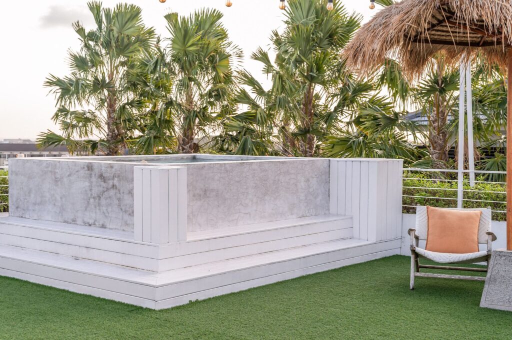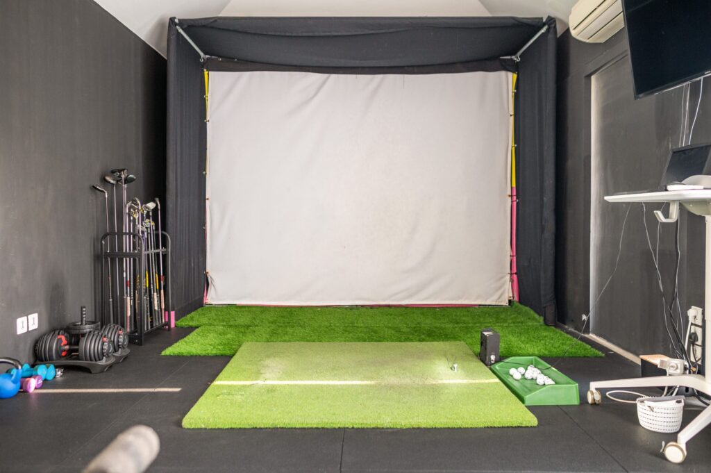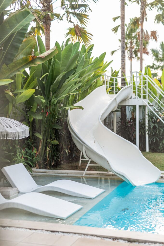 Designed with both relaxation and entertainment in mind, the villa offers multiple leisure spaces. The open or enclosed living area overlooks a private pool and garden, where a waterslide and swing set create a personal oasis. A dedicated gym, golf simulator, and massage room cater to wellness and recreation, while the home theater and gaming console provide endless entertainment. The rooftop garden and jacuzzi serve as a crowning jewel, offering breathtaking panoramic views of the ocean to the west and the majestic mountains to the north. A lush tropical landscape surrounds the outdoor BBQ area, perfect for alfresco dining, while soccer goals add an extra touch of charm.