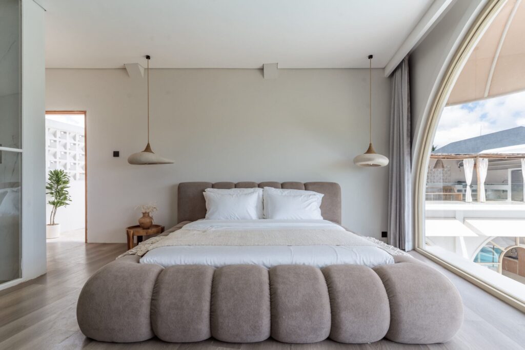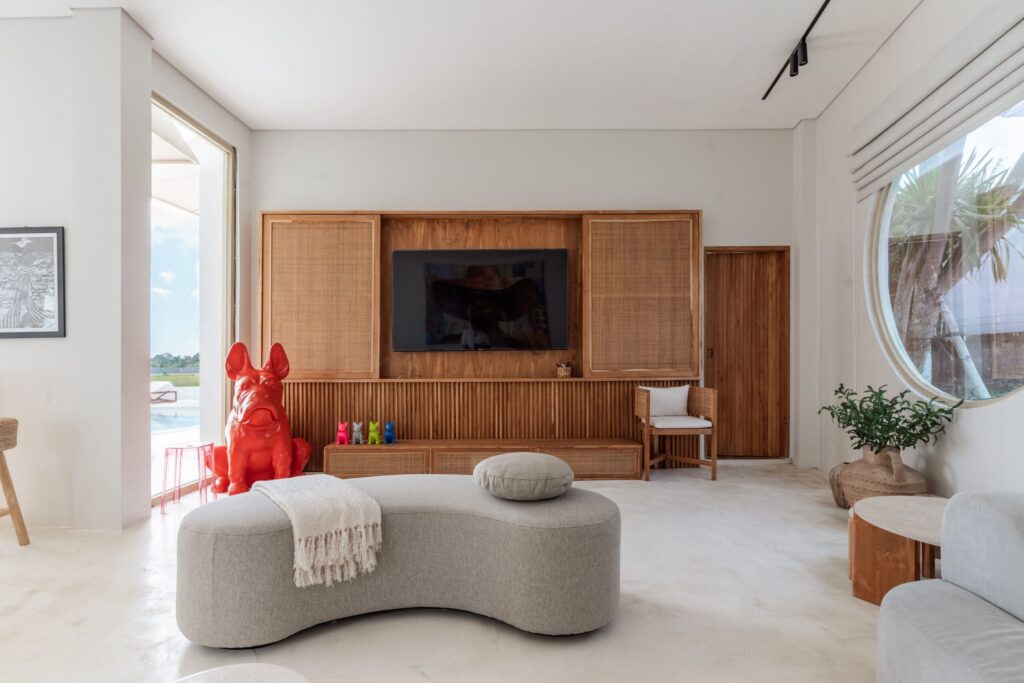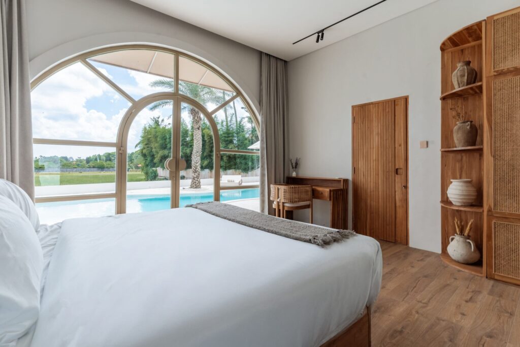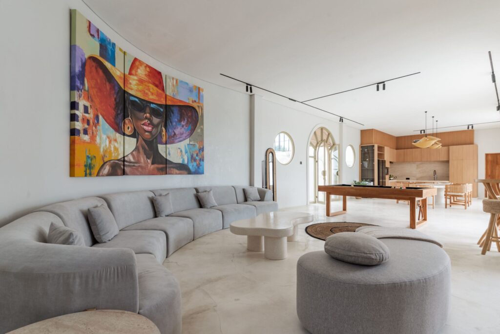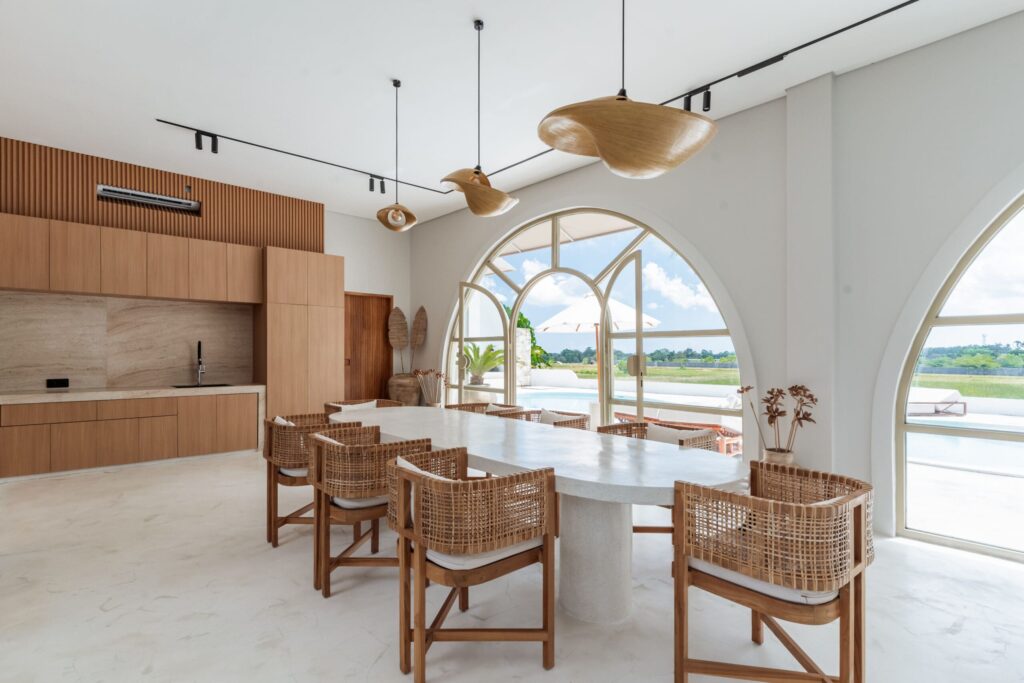 Designed to embody effortless sophistication, the villa features 5 luxurious en-suite bedrooms adorned with soft, earthy tones. Large arched windows flood each room with natural light while framing picturesque views of the private pool and lush tropical surroundings. The spacious living area creates a seamless space for relaxation and connection, while the open-concept kitchen and dining area strike the perfect balance between style and functionality. Featuring sleek wooden cabinetry, elegant pendant lighting, and a spacious dining table, this inviting space is designed for both intimate family meals and grand dinner parties.