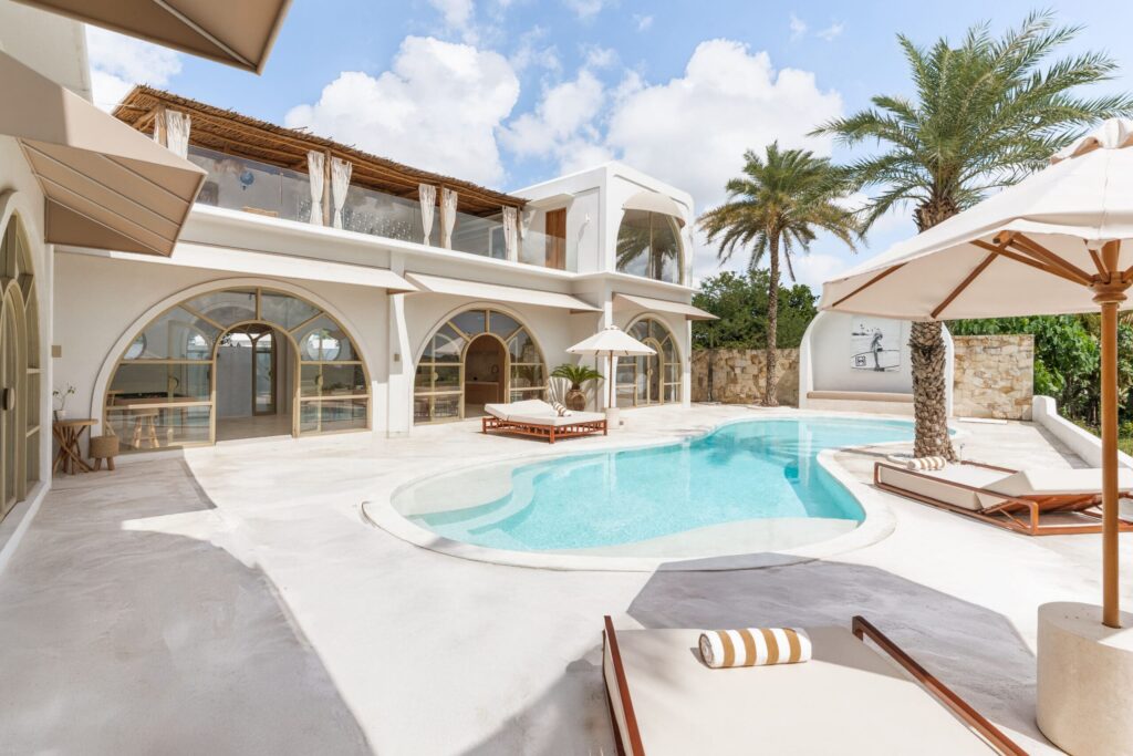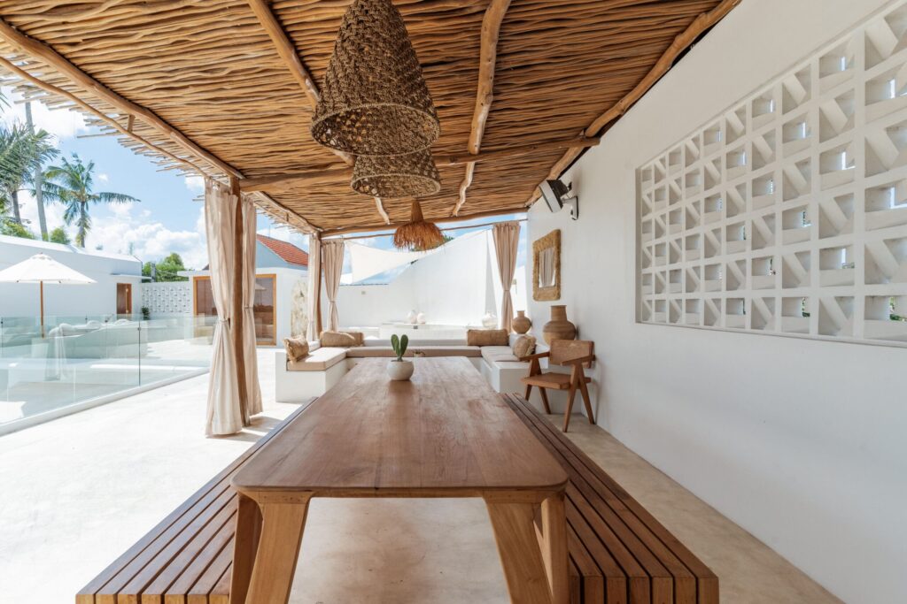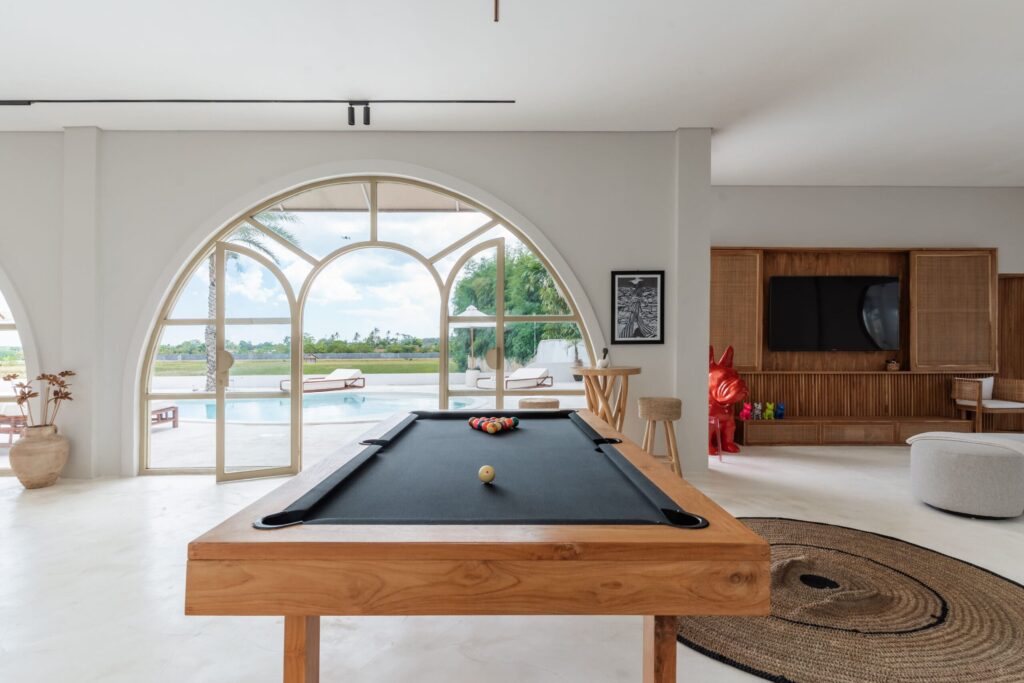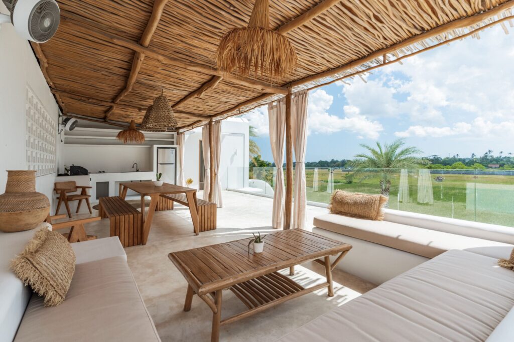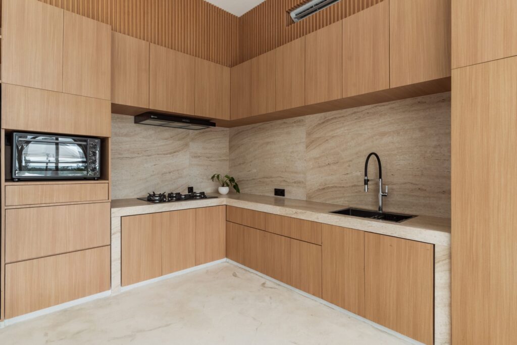 Designed to embody effortless sophistication, the villa features 5 luxurious en-suite bedrooms adorned with soft, earthy tones. Large arched windows flood each room with natural light while framing picturesque views of the private pool and lush tropical surroundings. The spacious living area creates a seamless space for relaxation and connection, while the open-concept kitchen and dining area strike the perfect balance between style and functionality. Featuring sleek wooden cabinetry, elegant pendant lighting, and a spacious dining table, this inviting space is designed for both intimate family meals and grand dinner parties.
