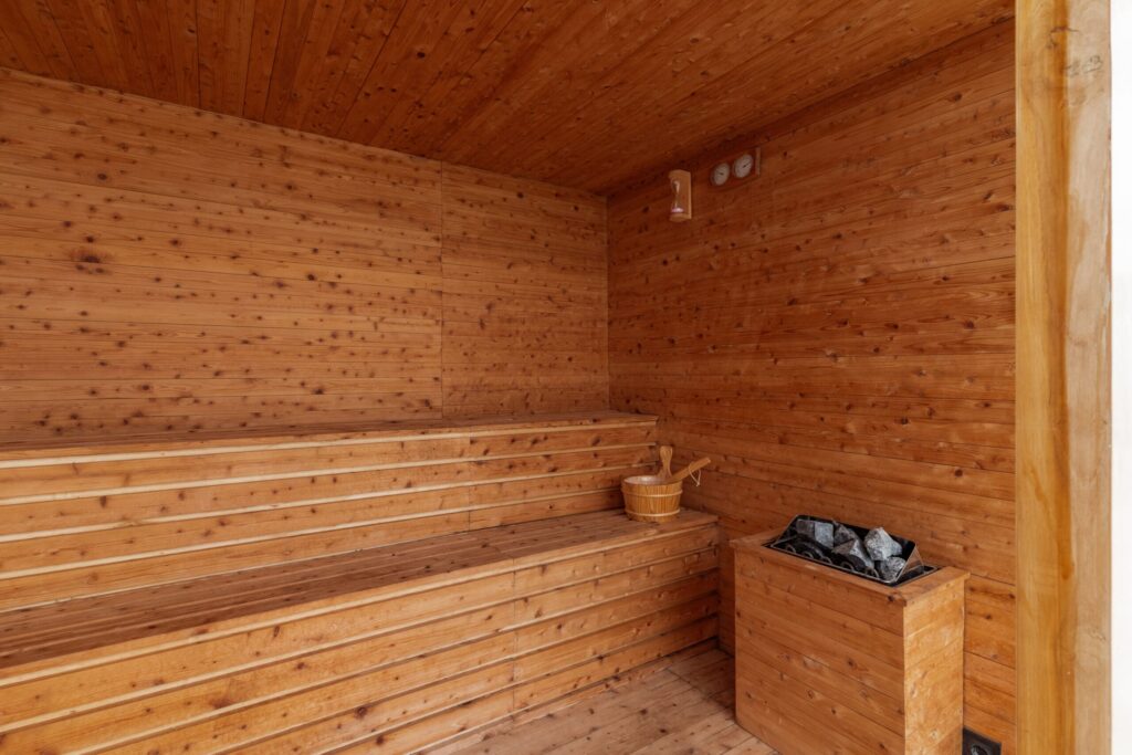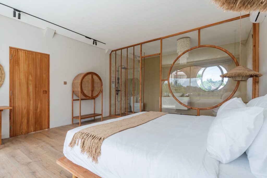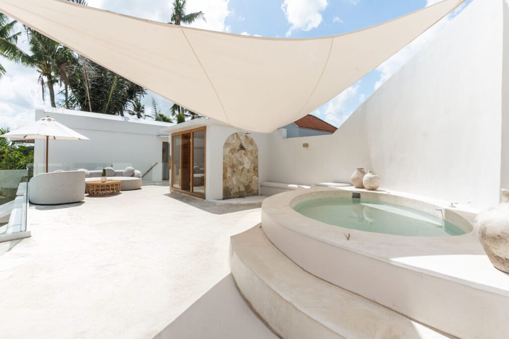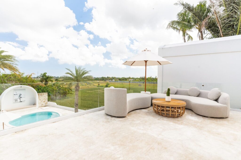 Blurring the lines between indoor and outdoor living, the villa boasts a breathtaking private pool retreat, surrounded by swaying palm trees and luxurious sun loungers. One of its most exceptional features is the stunning rooftop lounge, offering panoramic views of lush rice fields. This breezy, semi-outdoor space, with its natural wood and rattan finishes, is perfect for unwinding, dining, or entertaining guests while embracing Bali’s serene landscape. Furthermore, the villa features a sauna room perched on its scenic rooftop, thoughtfully designed for ultimate relaxation and offering breathtaking panoramic views of the surrounding landscape.