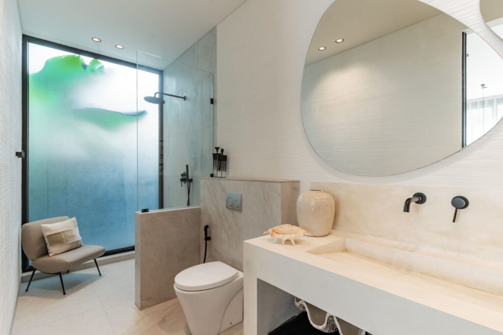 The villa features 4 spacious bedrooms, each designed to maximize natural light and capture peaceful views of the surrounding greenery. The open-plan kitchen flows effortlessly into the dining area and out onto a sun-drenched poolside deck — ideal for both everyday living and entertaining. High-end finishes and refined interior touches are found throughout, with floor-to-ceiling glass doors opening up the expansive living area to the central garden and private terraces, blurring the lines between indoor and outdoor living. Whether you’re lounging by the private pool or relaxing inside the light-filled interiors, this home fosters a true connection to nature while offering upscale comfort and privacy.