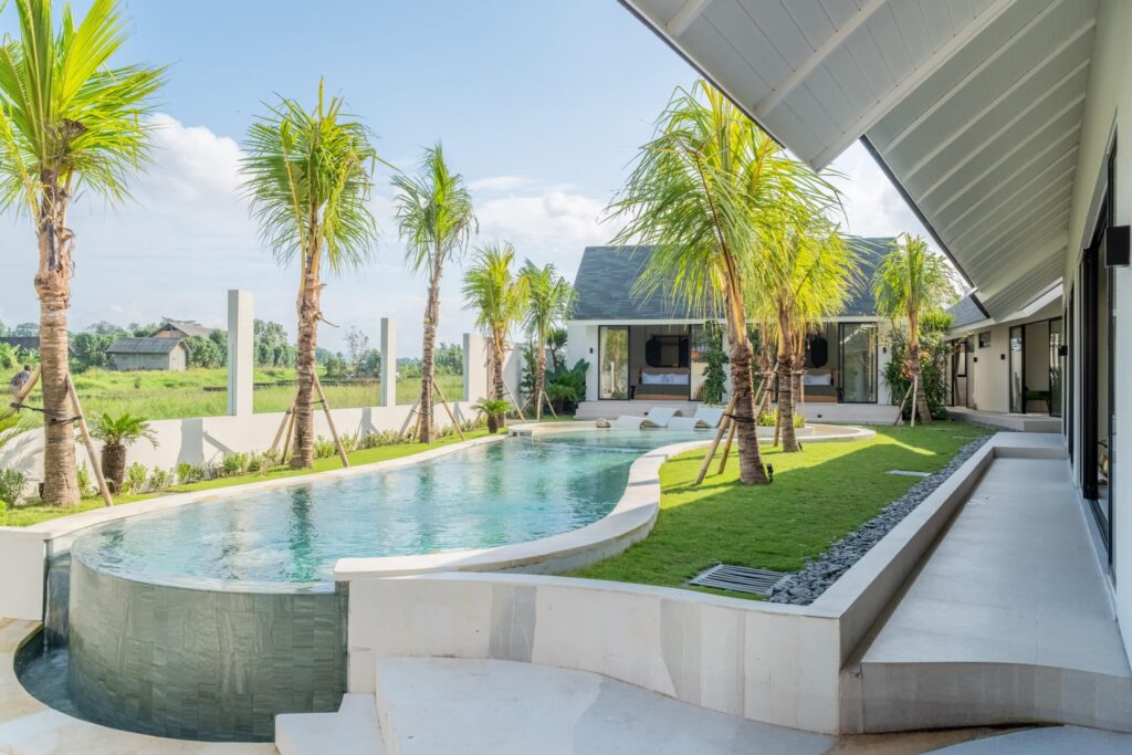 The villa features 6 ensuite bedrooms, each styled with soft, organic touches that blend clean lines with earthy elegance. At its heart lies a sunken living room in an open-plan living area, designed with expansive windows to flood the space with natural light and fresh air. Set beside lush rice fields and tropical greenery, the villa offers an immersive experience in natural beauty and local authenticity. Step outside to a uniquely curved private pool with built-in loungers, inviting total relaxation. Grassy lounging areas, garden walkways, and shaded corners throughout the outdoor space offer countless spots to breathe in the essence of Bali. A rooftop terrace, complete with sun loungers and panoramic rice paddy views, is the perfect place to unwind and enjoy spectacular sunsets.