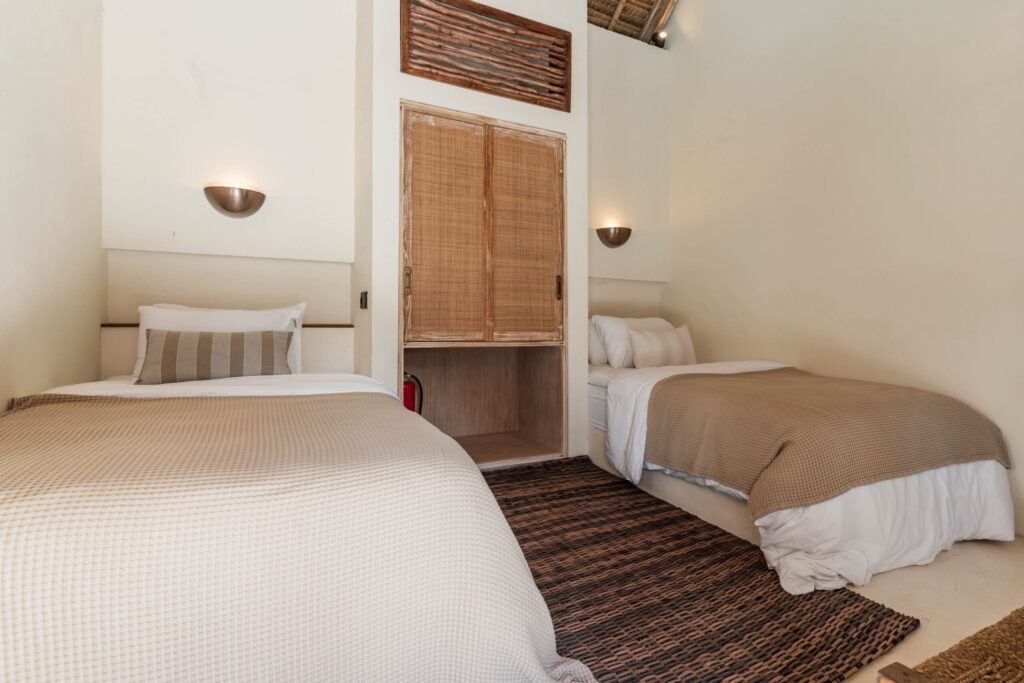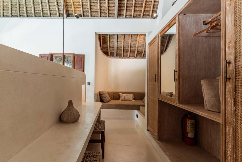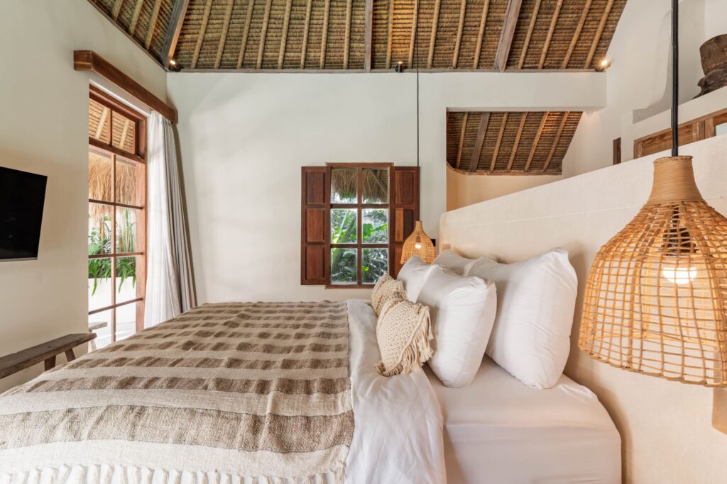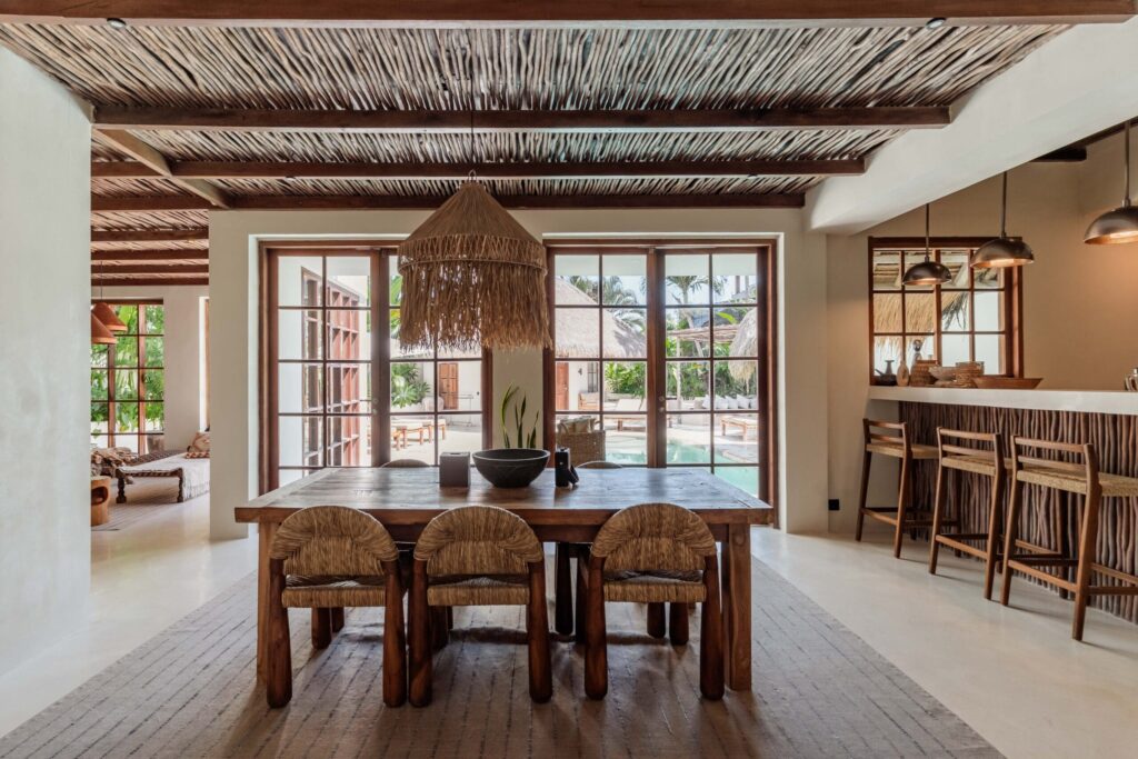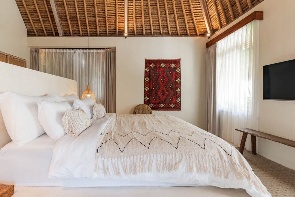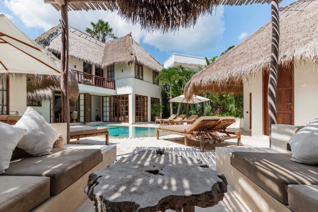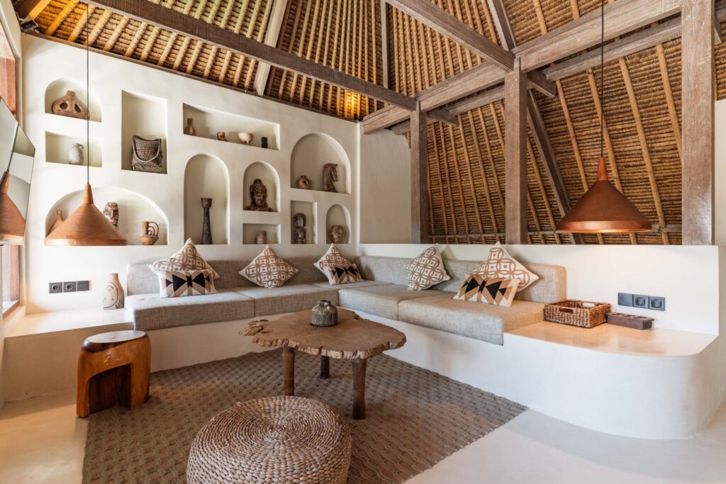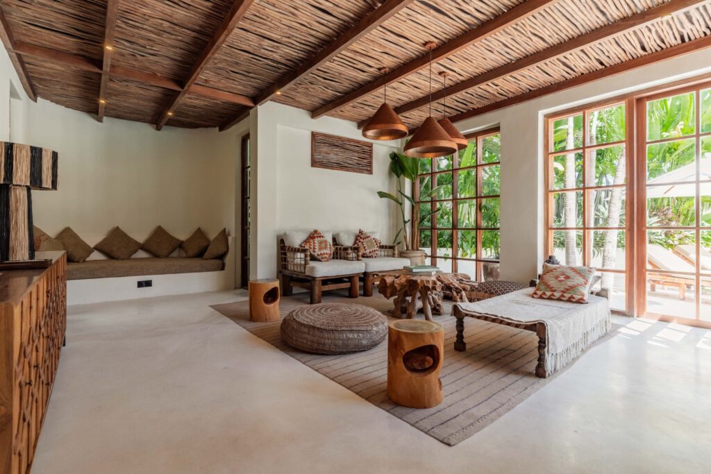 The 4-bedroom villa is crafted with high-end natural materials—think thatched roofs, reclaimed wood, woven textures, and organic stone—every corner of the villa radiates warmth, character, and authenticity. The spacious open-plan living spaces, cozy built-in lounges, soaring vaulted ceilings, and expansive windows invite in an abundance of natural light while blurring the line between indoor and outdoor living. At the heart of the villa lies a lush central courtyard, featuring a crystal-clear private pool flanked by inviting sun loungers, a shaded outdoor lounge, and swaying palms—perfect for slow, sun-drenched days.