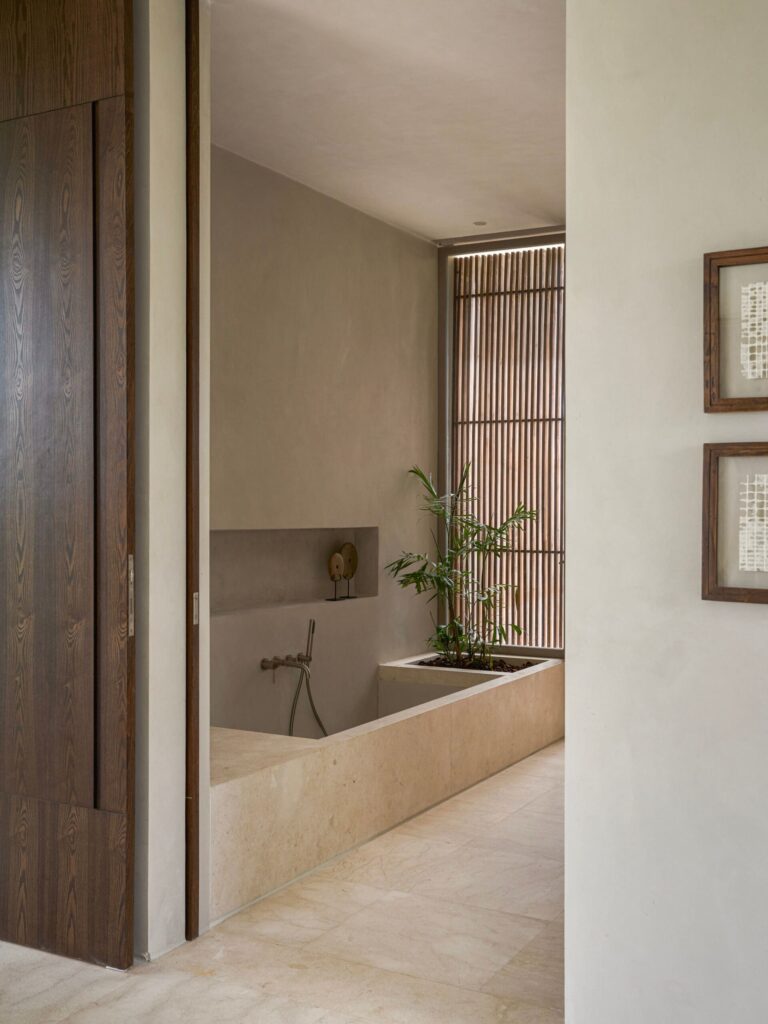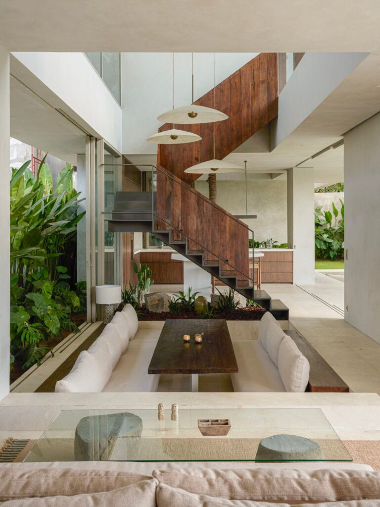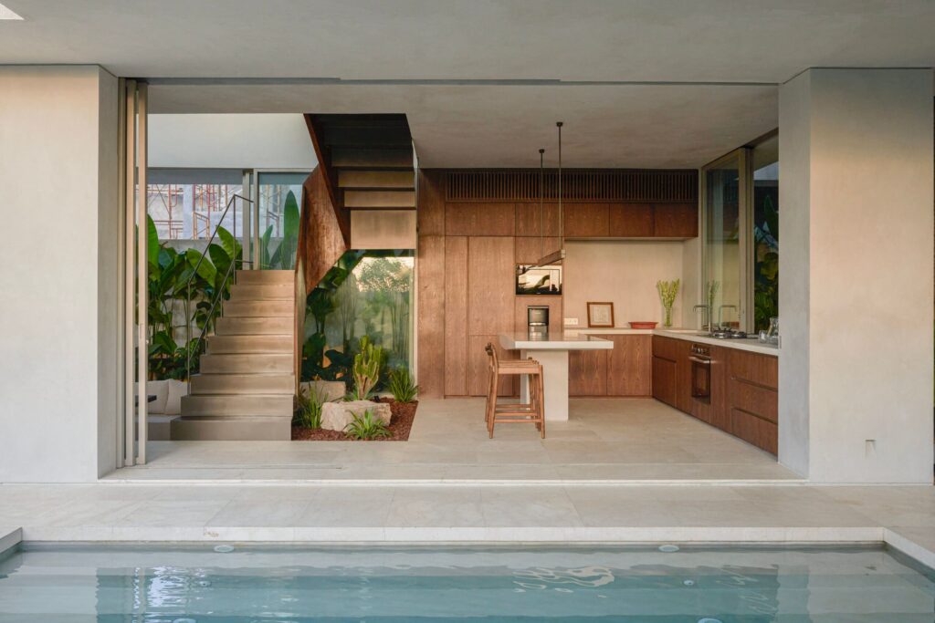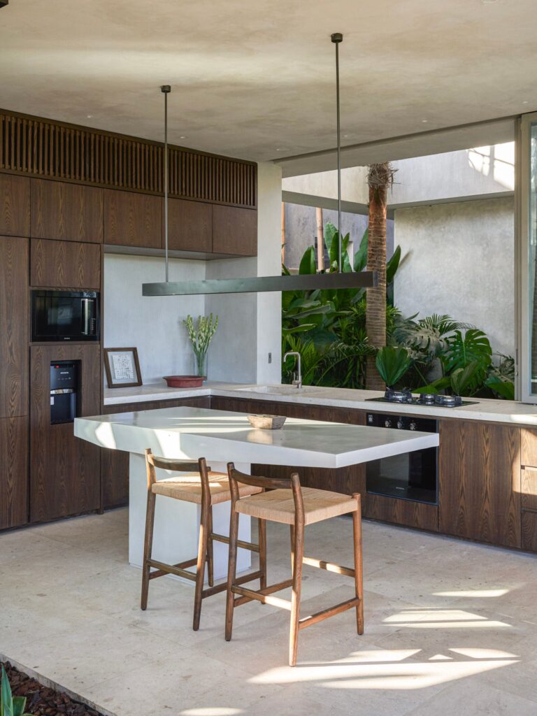 Spread across two levels, the villa’s interiors are infused with natural light, offering seamless flexibility between enclosed comfort and open-air living. A statement sunken dining area flows effortlessly into a sleek, contemporary dry kitchen—curated to elevate both daily rituals and intimate gatherings.