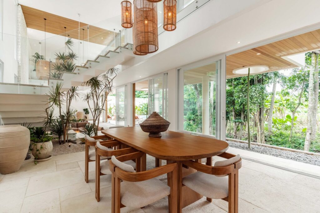 Thoughtfully designed with an elongated layout to maximize natural light and embrace its lush surroundings, the villa features four generous ensuite bedrooms, all styled in soft, neutral tones and complete with an impressive walk-in wardrobe. The open-plan living area is anchored by a soaring double-height ceiling, creating an airy, elegant sense of space. A sunken lounge and sculptural feature staircase add architectural character, while the gourmet kitchen and dining area flow effortlessly within the layout. Expansive sliding glass doors open to reveal a curving infinity-edge pool, bordered by tropical gardens, mature greenery, and tranquil river views—seamlessly merging indoor comfort with outdoor serenity.