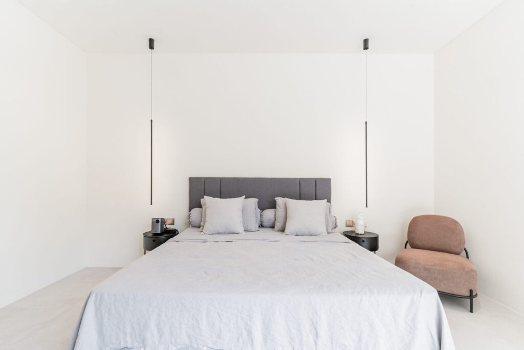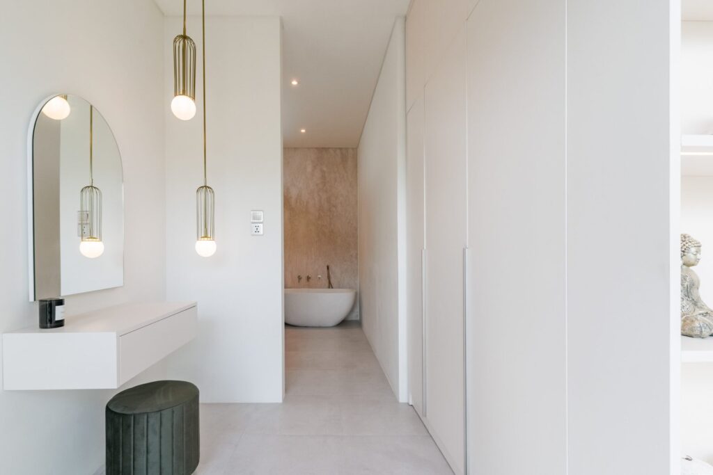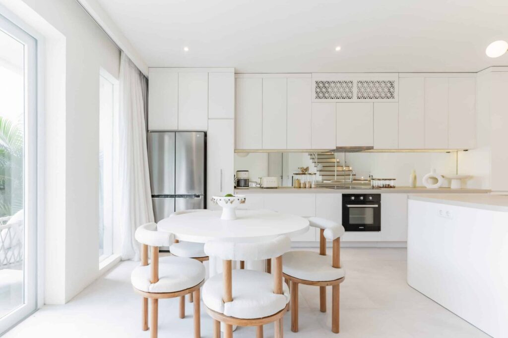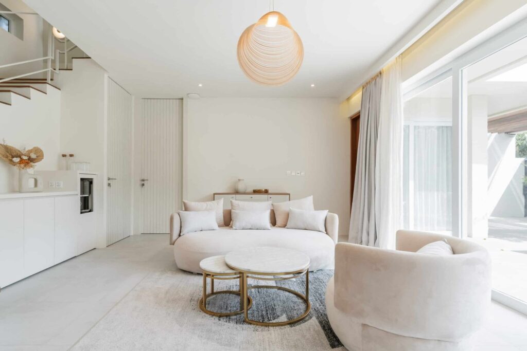 Designed with a soothing palette of soft neutrals and clean architectural lines, this Modern Mediterranean villa features three ensuite bedrooms, including a master suite with a spacious walk-in wardrobe and a freestanding bathtub, evoking the ambiance of a private spa. The adjoining living and dining areas are curated with designer furnishings and tactile, soft textures, while the fully equipped kitchen is a statement of form and function, fitted with premium appliances, sleek custom cabinetry, and a sculptural island with ample seating for gatherings.