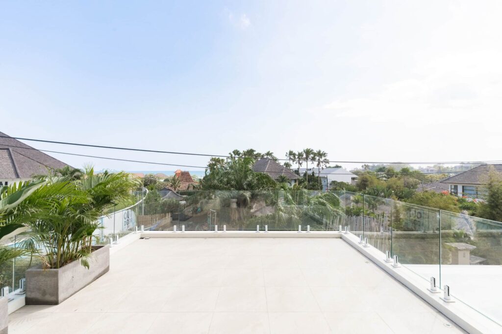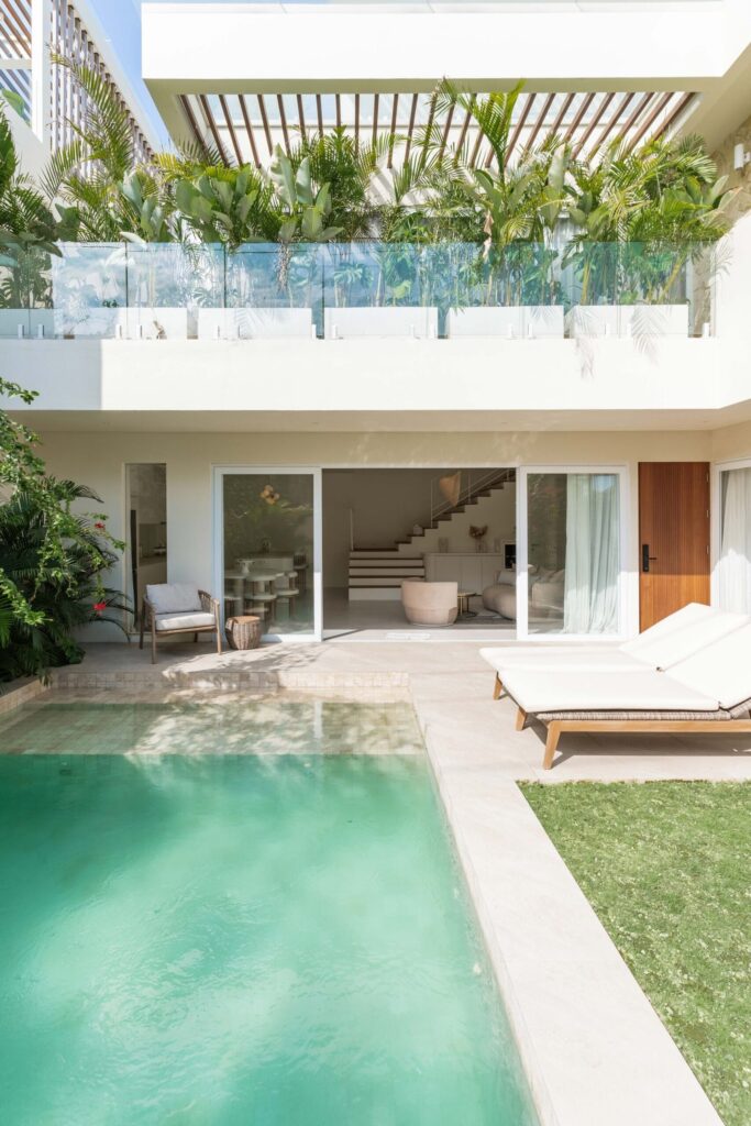 Crowning the property is a private rooftop alfresco area, complete with sun loungers for golden-hour relaxation and a built-in sauna, all set against a panoramic backdrop of ocean views and tropical sunsets. This upper-level haven is designed for intimate entertaining, wellness rituals, or serene solitude, while the heart of the villa, a turquoise-tiled pool glistens amidst a lush, green courtyard. Framed by tropical flora and accompanied by elegant sun loungers, it offers the perfect setting for early morning swims or leisurely afternoons in the sun.