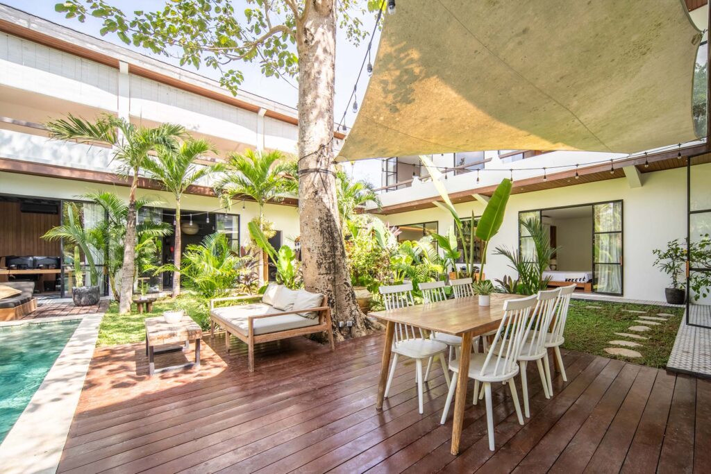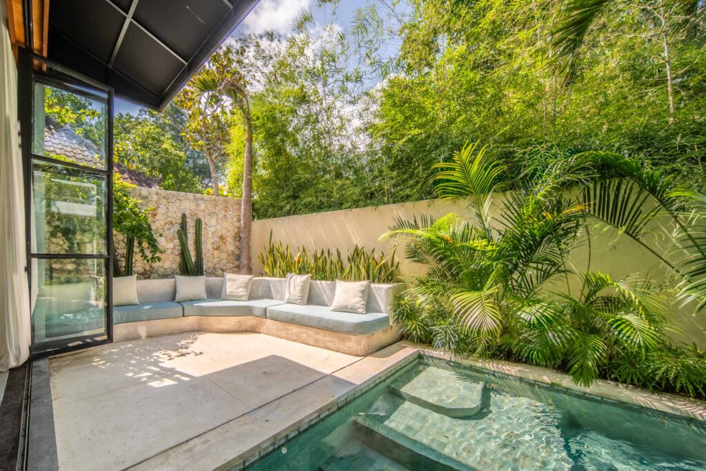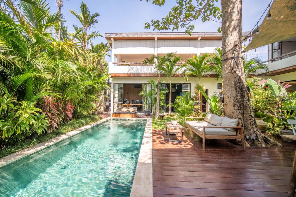 At the heart of the villa lies an expansive tropical garden, a sanctuary of vibrant greenery that frames the residence in natural beauty. The private pool, accompanied by inviting poolside lounges, serves as the centerpiece of this outdoor haven,perfect for basking in the island sun or sharing cherished moments with family and friends.
