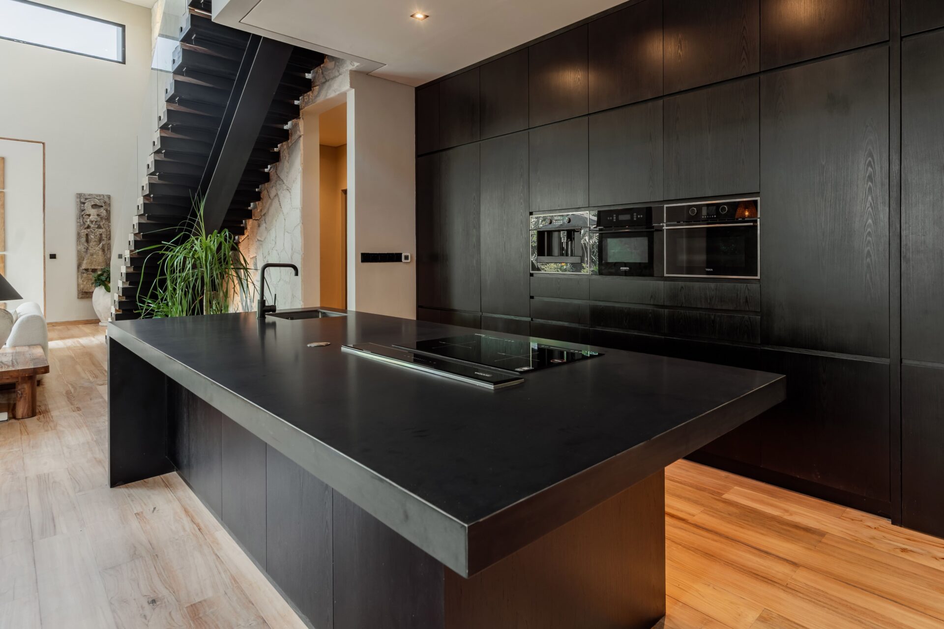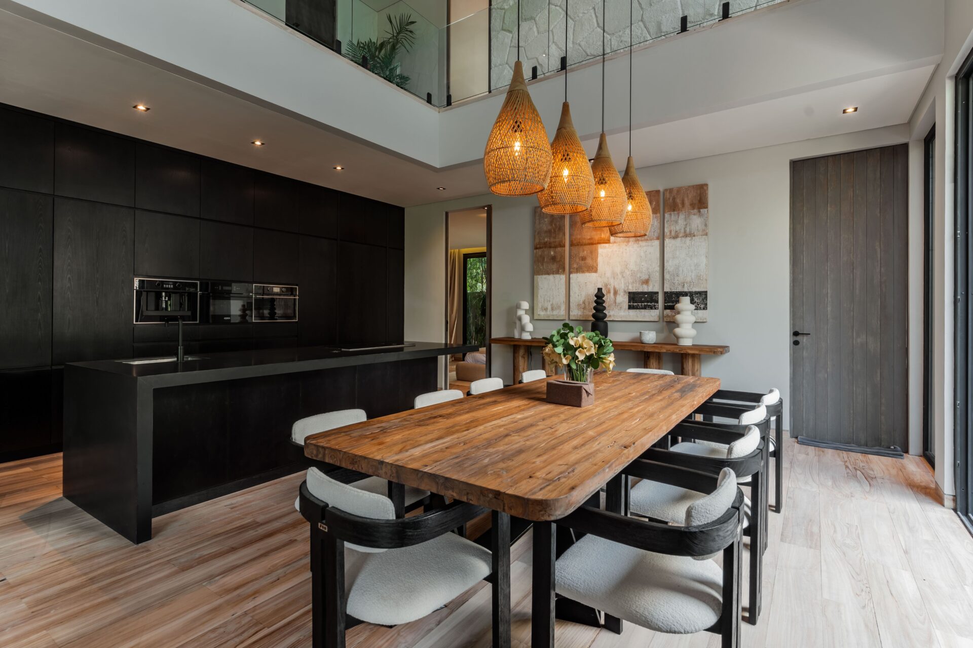 The villa’s façade, wrapped in dark stone, creates a bold visual contrast against the softer, earth-toned interiors sculpted with natural textures and solid finishes. This thoughtful balance between strength and serenity defines the character of the home. Inside, four ensuite bedrooms are positioned to embrace privacy and lush garden views, while the open-plan living space seamlessly connects the dry kitchen—adorned with natural timber accents—to the dining and lounge areas illuminated by woven light fixtures that cast a warm, ambient glow.